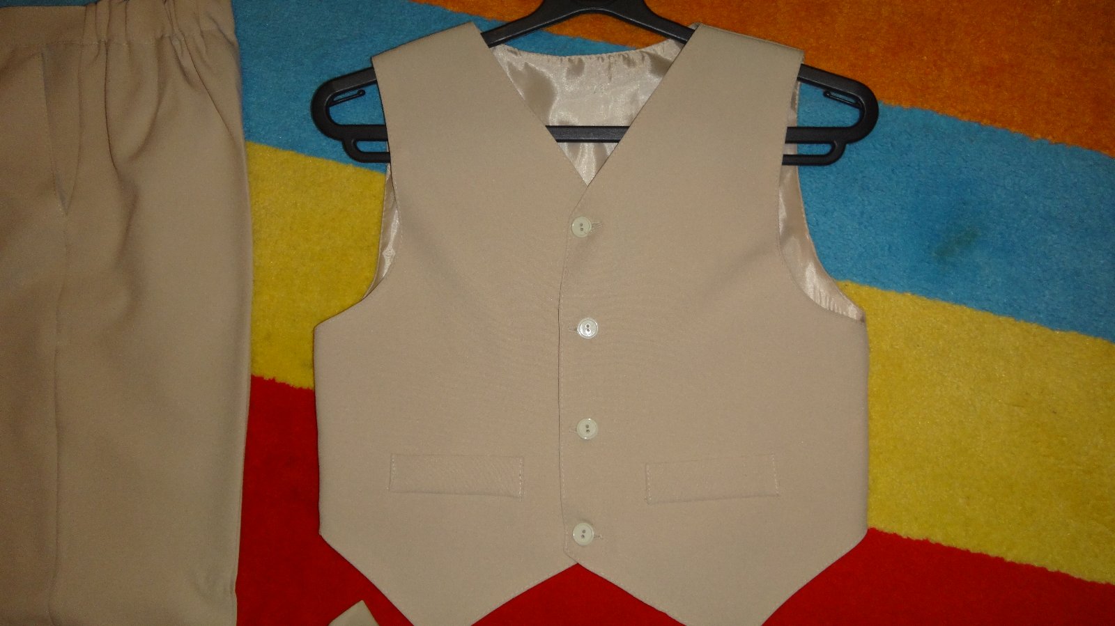 Predám tento komplet. Motýlik patrí k tomu. Nohavice sú v páse na gumu, čiže sa prispôsobia. Nohavice boli skrátené cca. o 10 cm, nakoľko boli veľmi dlhé. Vrchná časť veľmi pekná. Syn mal oblečenú iba bielu košeľu, a na to béžový lajblík. Lajblík zakrýval vrchnú časť nohavíc, čiže gumu v páse nevidno. Nohavice sú ale šité spredu ako nohavice bez gumy. Je to na chlapca - tretiaka, na chudšieho, nie na plného chlapčeka. Veľkosť vestičky: podpazušie: 41 cm x2, dĺžka od pleca až po spodný cíp je 44 cm. Nohavice celková dĺžka je 87 cm, od sedu nadol je 64 cm, pás je 28 cm x2, ale dá sa rozšíriť (gumový pás) až na 38 cm x2.