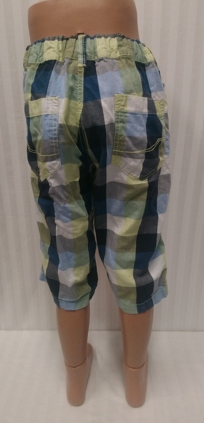Farebné kockované trištvťáky, v páse vzadu gumička, v páse vnútri gumička na nastavenie šírky, zapínanie na zips a gombík vpredu , vrecká vpredu a vzadu,