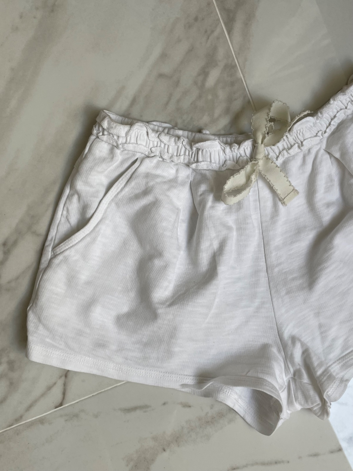 Predám jemné biele šortky značky United Colors of Benetton. Príjemný bavlnený materiál, elastický pás so zdobenou mašličkou. Vhodné na leto, domáce nosenie alebo ako pyžamové kraťasy.