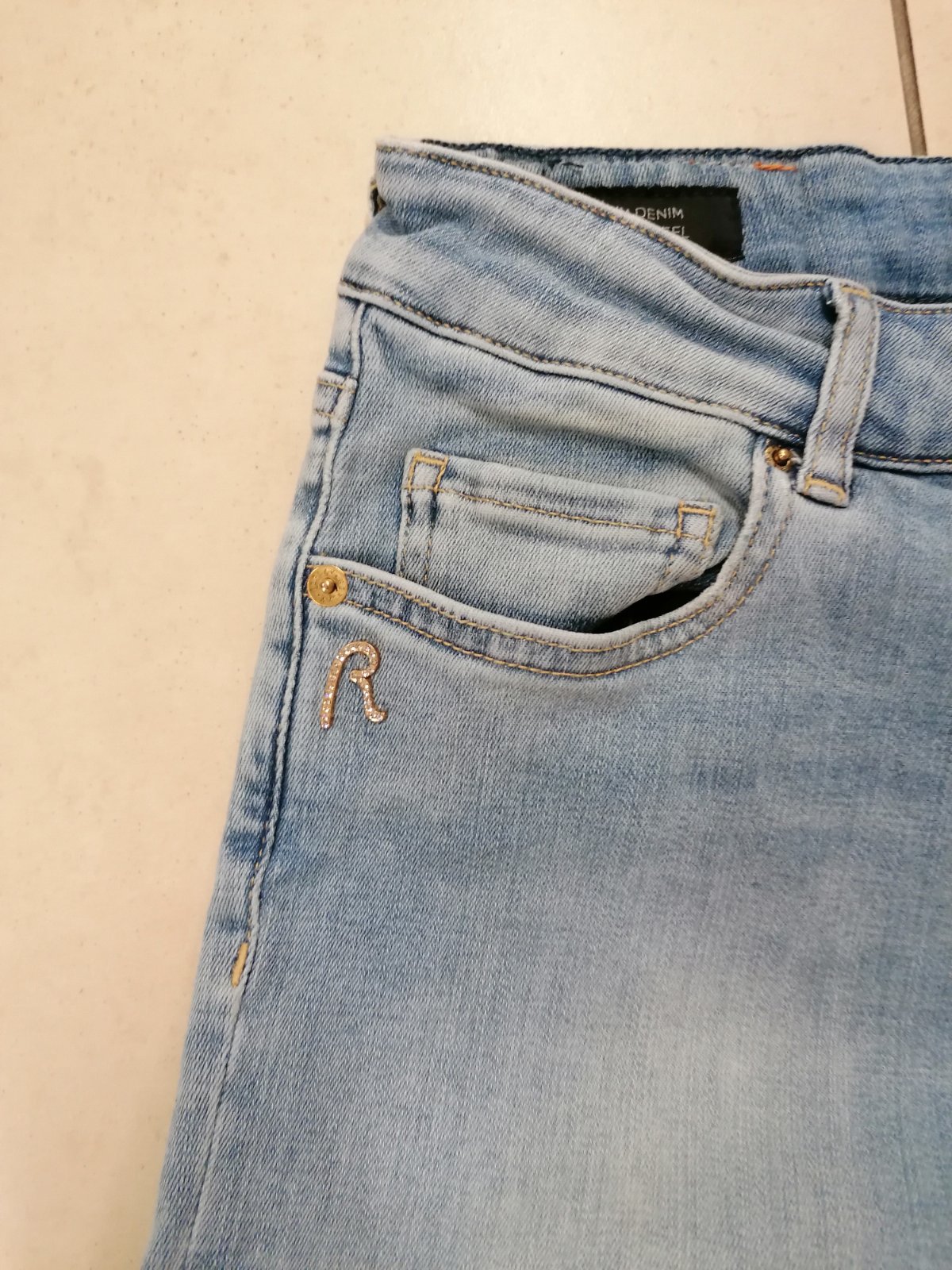 Riflové trištvrťáky, veľ. 26 (S). Sú pružné, takže povolia, mäkká riflovina. Oblečené asi 5x, lebo dcére sú už malé. Cena: 8,00 EUR + pošt.