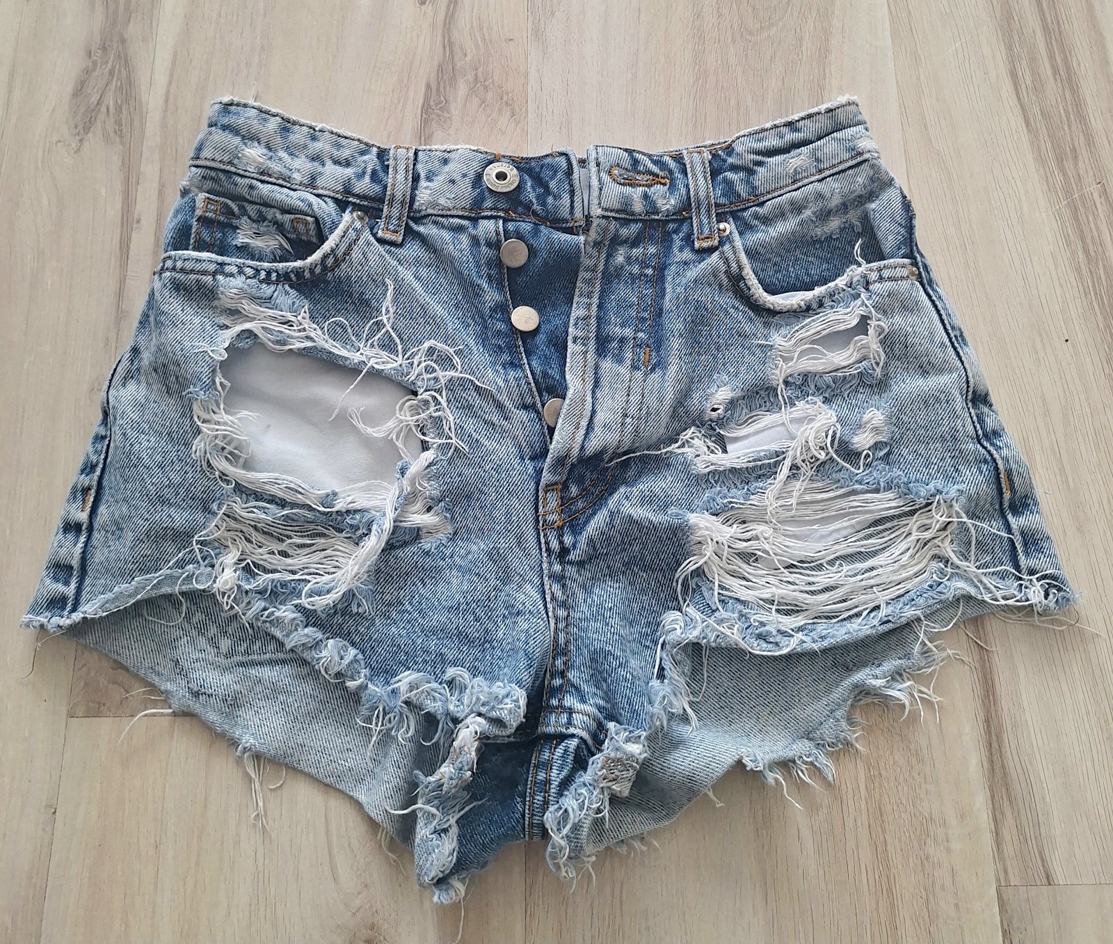 Rifľové kraťase s úzkym pásom a širšími nohavicami. Celková dľžka 42 cm a vnútorná 15 cm. Látka je klasický denim, nie ten tenký. Bez chýb.