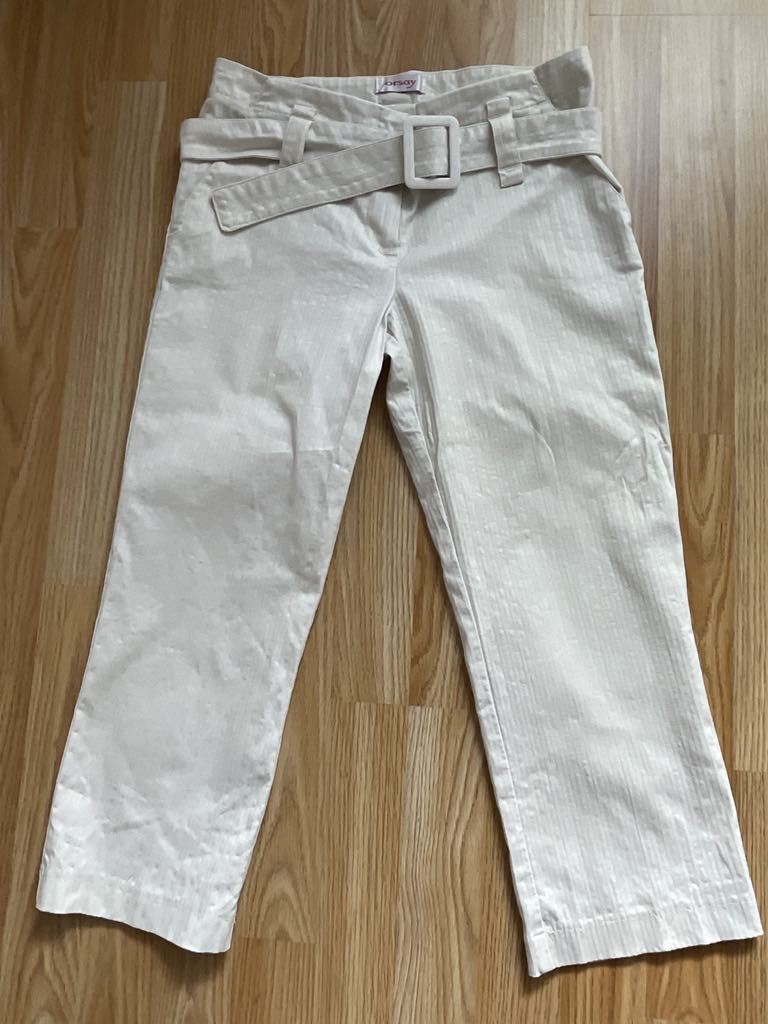 Nohavice v perfektnom stave, snehobiele, veľkosť písaná 36. Pás 36cmx2, dĺžka 71cm.