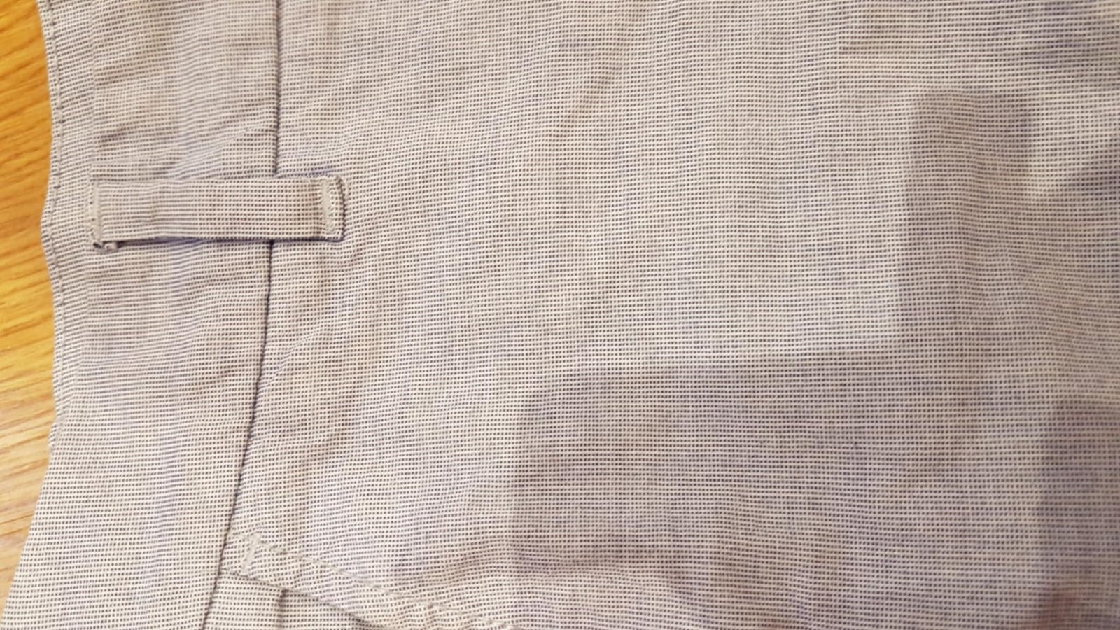 výborný stav, látka nie je hladká, ale štruktúrovaná, - detailné foto, farba je ako na hlavnej foto bledo modrá. Pás 38 x 2 cm, celková dĺžka je 35 cm. V predu sú vrecká, v zadu falošné. Vo vnútri je ešte náhradný gombík. Materiál bavlna, elastan.