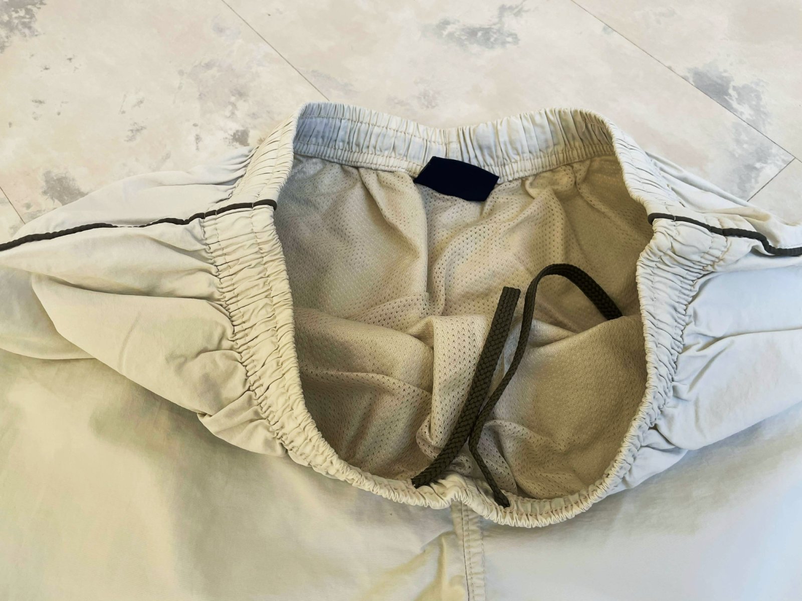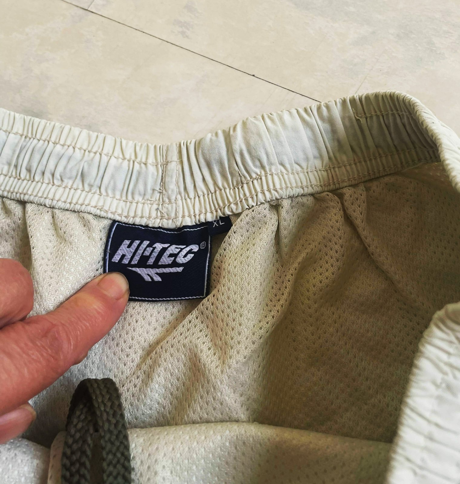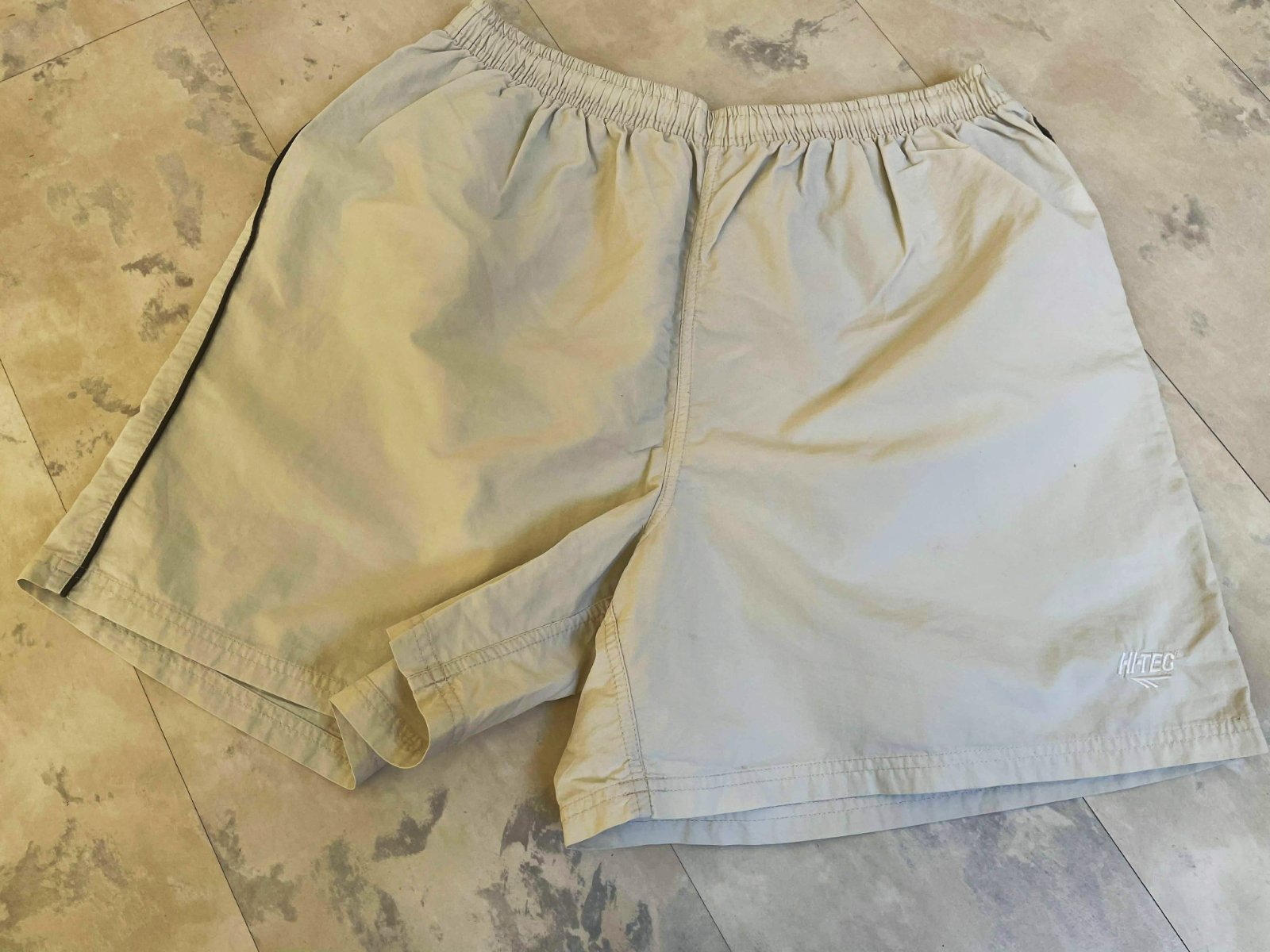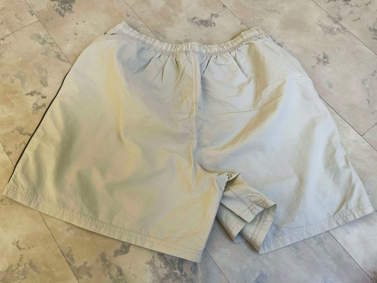 značkové kvalitné šortky,dnu sieťka,po bokoch olivovo zelený prúžok,top stav,iba preprané,svetlošedo - krémová farba,alebo lomená biela - slonia kosť, pás = 50 x 2, dlžka = 45 cm,noha dole = 37 cm,pekne sedia na postave,materiál podobný jemnej tenkej balóňakovine &