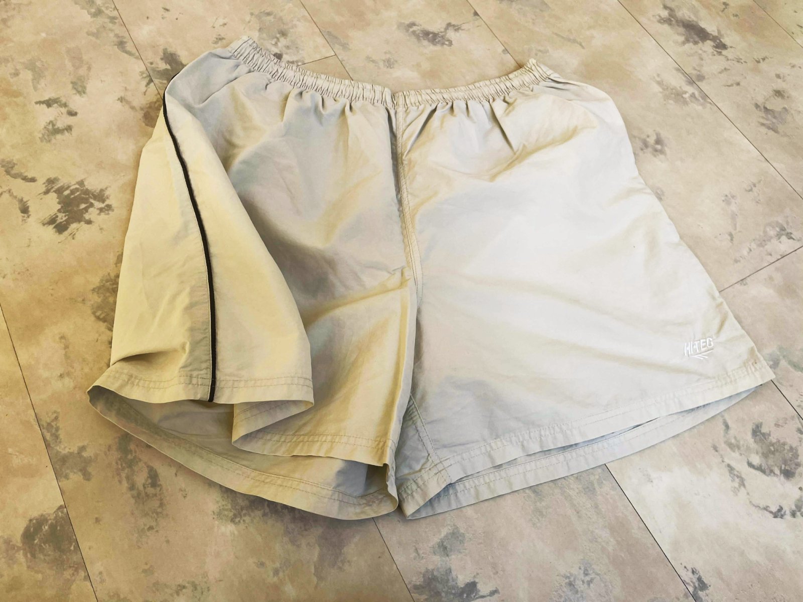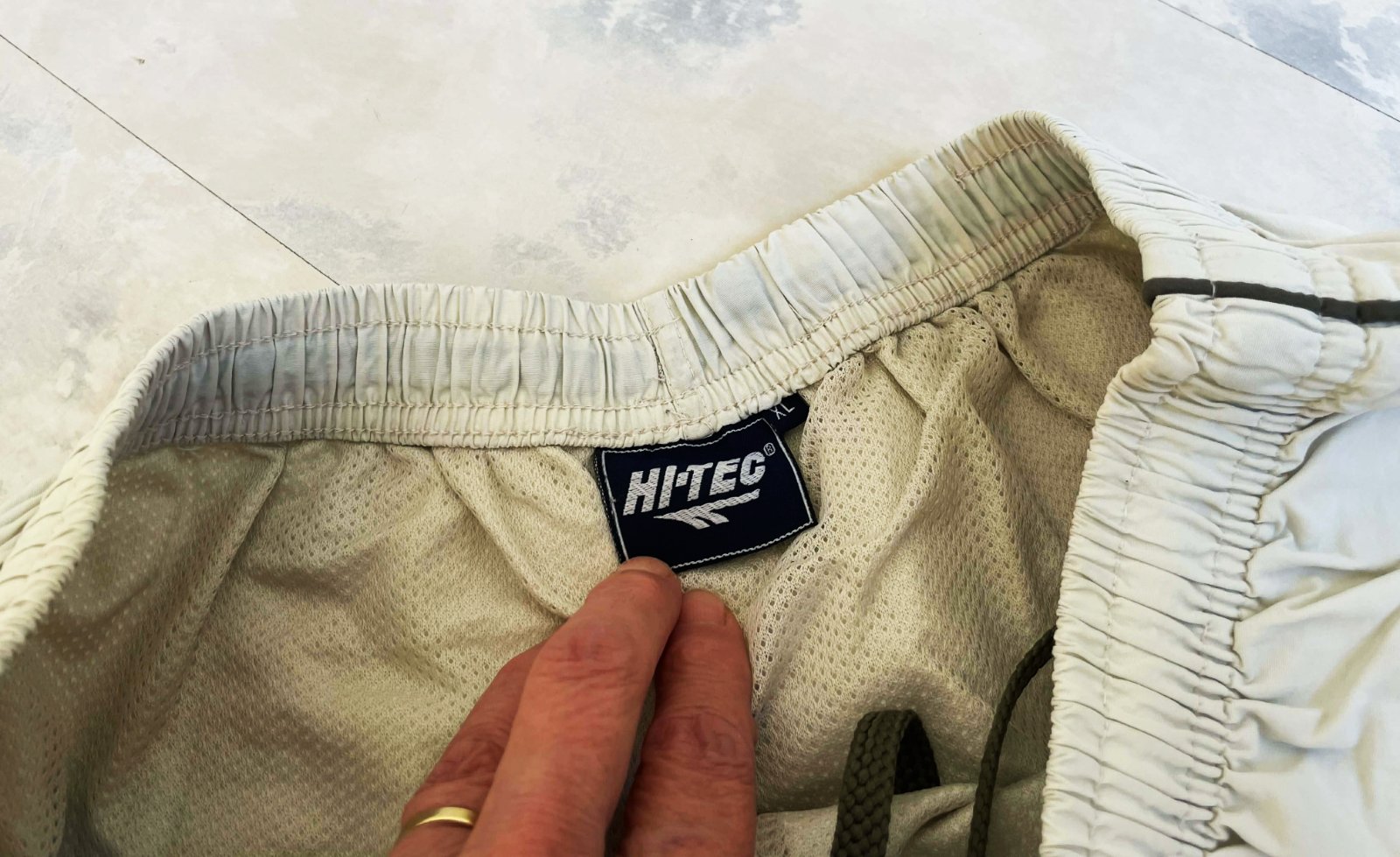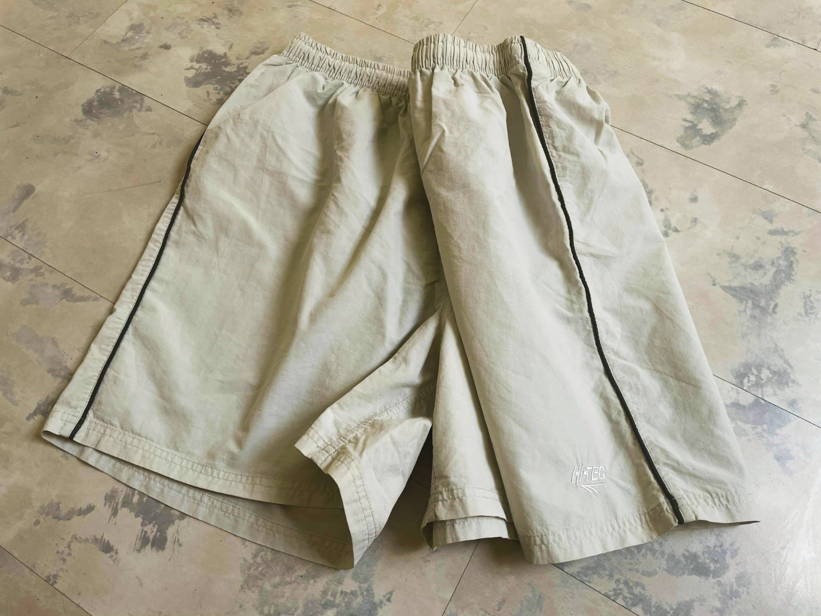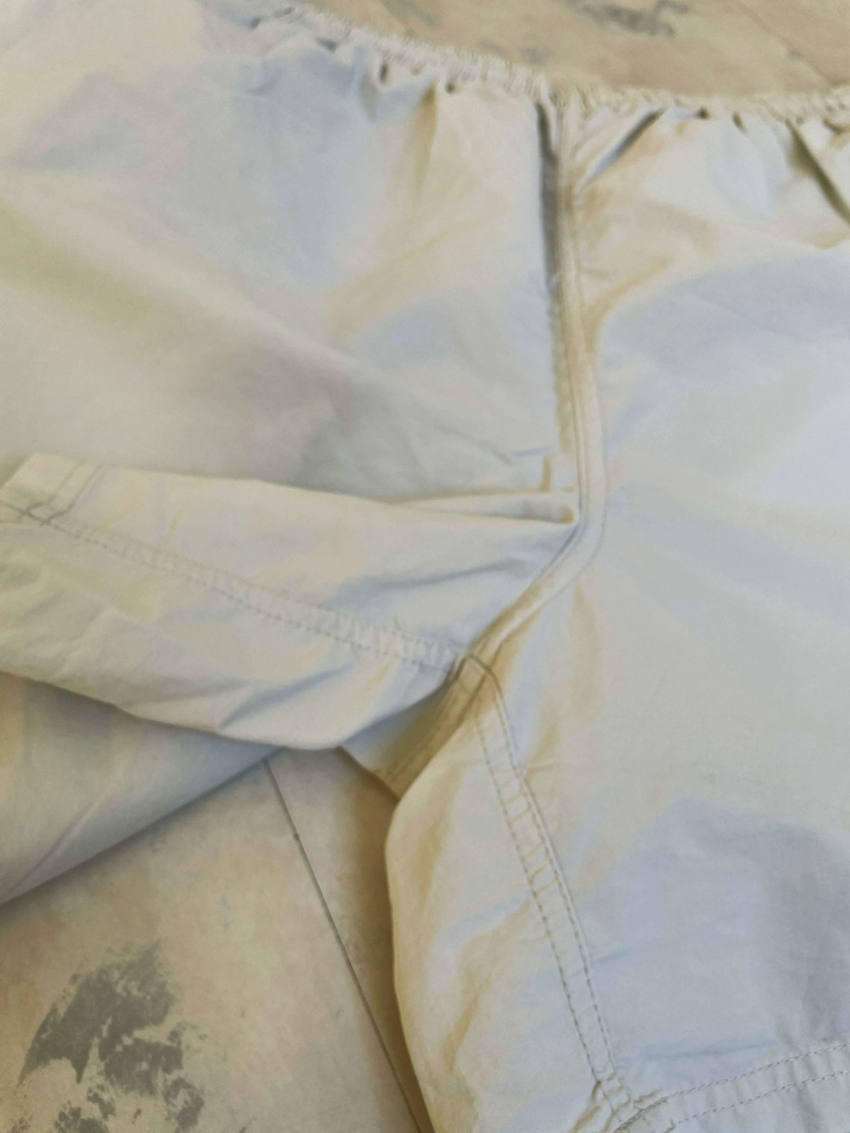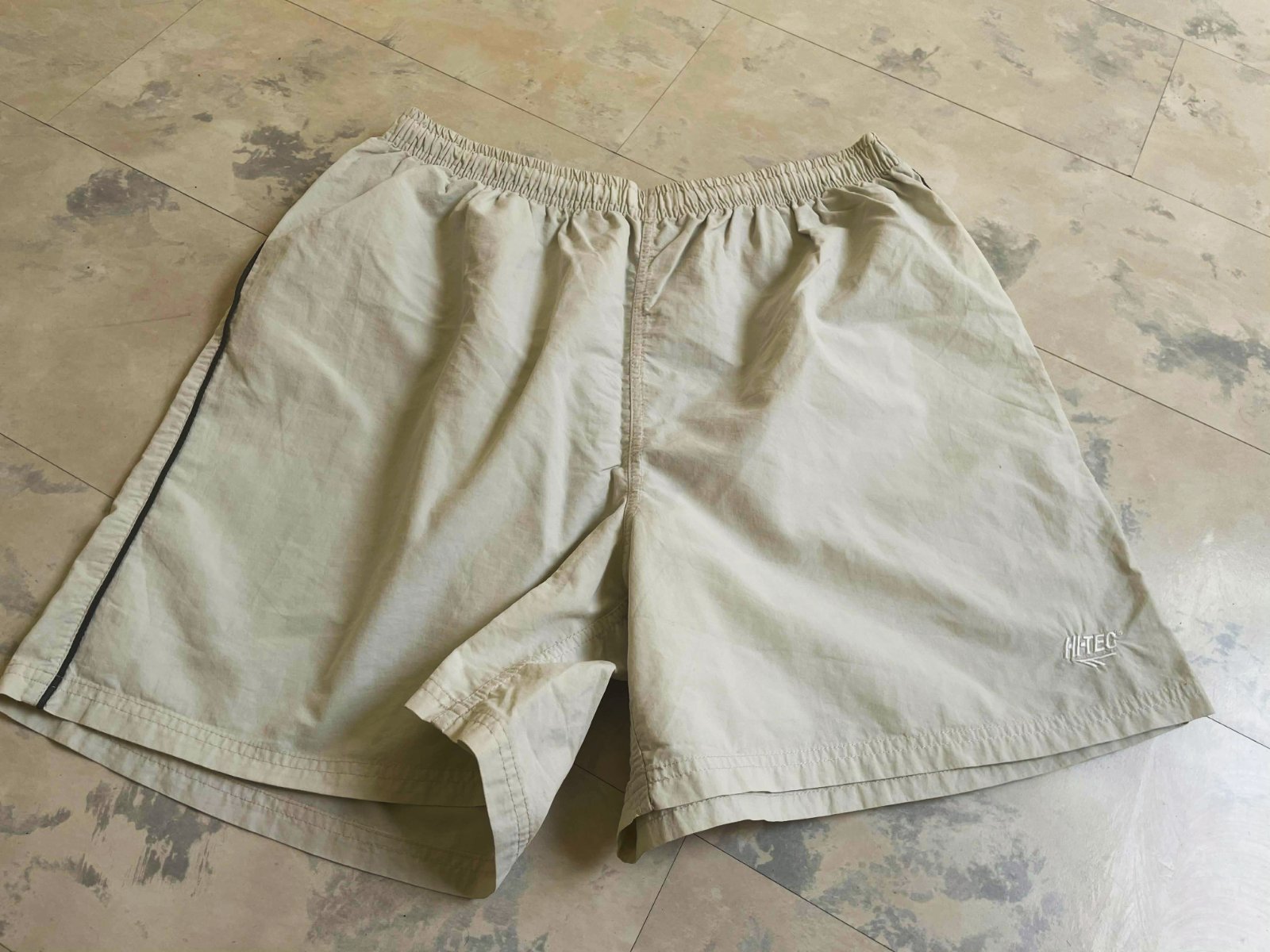 značkové kvalitné šortky,dnu sieťka,po bokoch olivovo zelený prúžok,top stav,iba preprané,svetlošedo - krémová farba,alebo lomená biela - slonia kosť, pás = 50 x 2, dlžka = 45 cm,noha dole = 37 cm,pekne sedia na postave,materiál podobný jemnej tenkej balóňakovine &