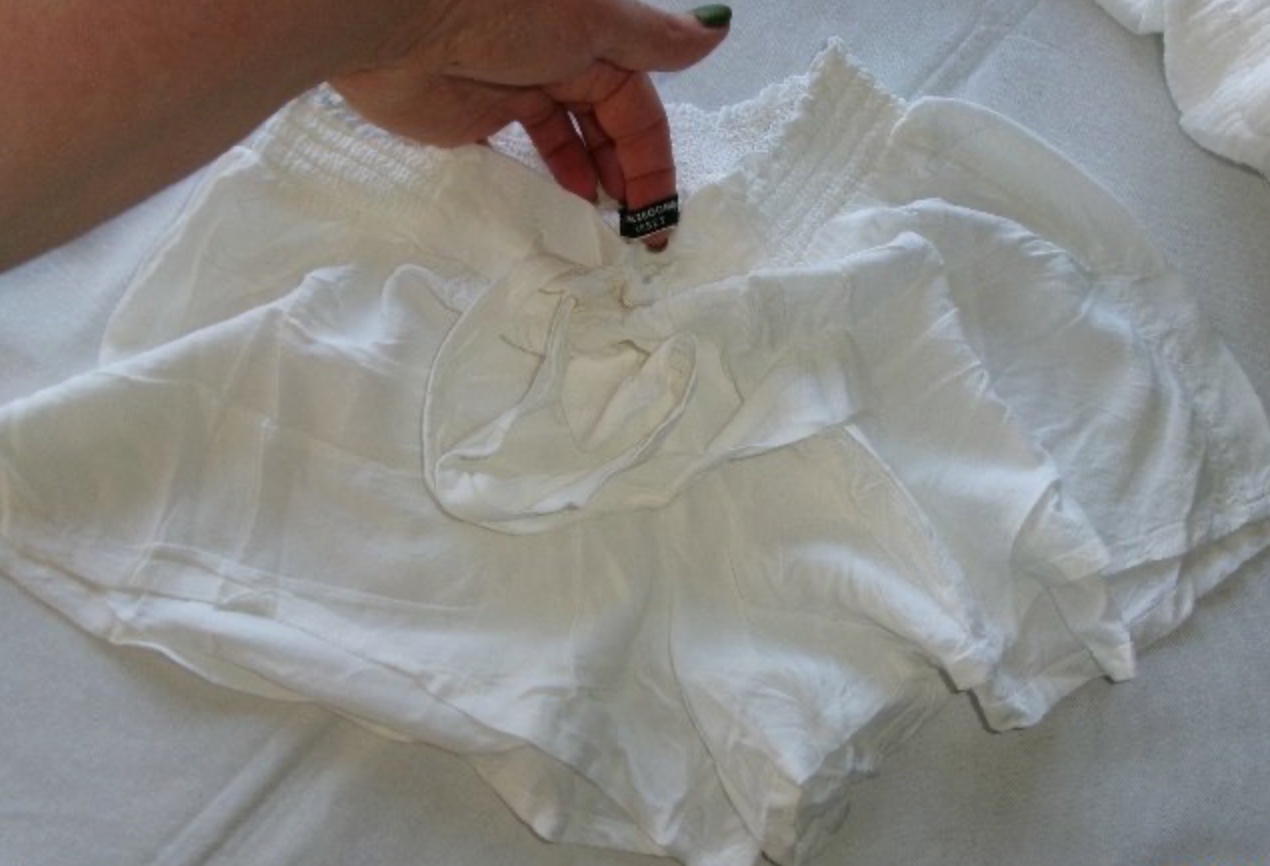 BIele krátke nohavice s potlačou MADE IN ITALY, nové s visačkou, zn. BUBY.S, v štýle "pin up" s potlačou dievčiny, krásny unikátny kúsok, luxusný lesklý pevnejší materiál, pekne drží tvar, nie je p...