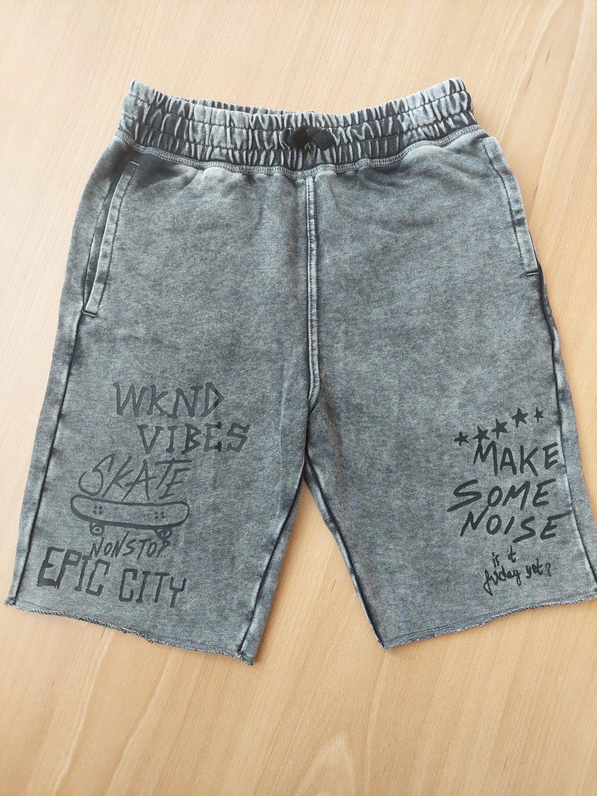 Šedé kraťasy zn. Reserved, velkosť 158. Su nosene, bez poškodení. Je to poddajný úplet, nezateplený, funkčná šnúrka v páse.