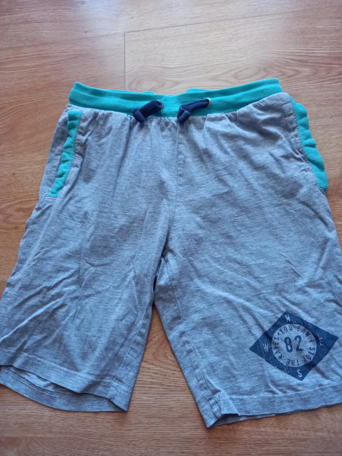 Kraťasy 146/152. K tomu plavky- guma už vyťahaná, ale dajú sa stiahnuť šnúrkou- o číslo menšie, sle velkostne sú robnaké sko sivé kraťasy.