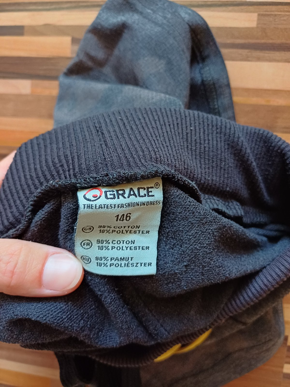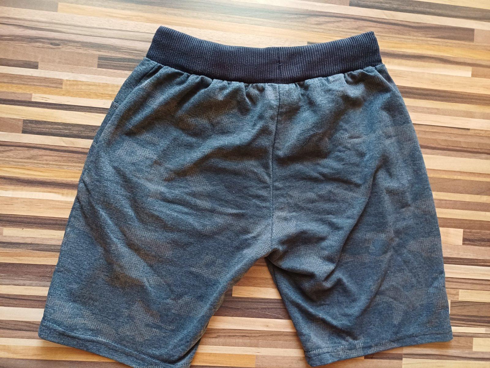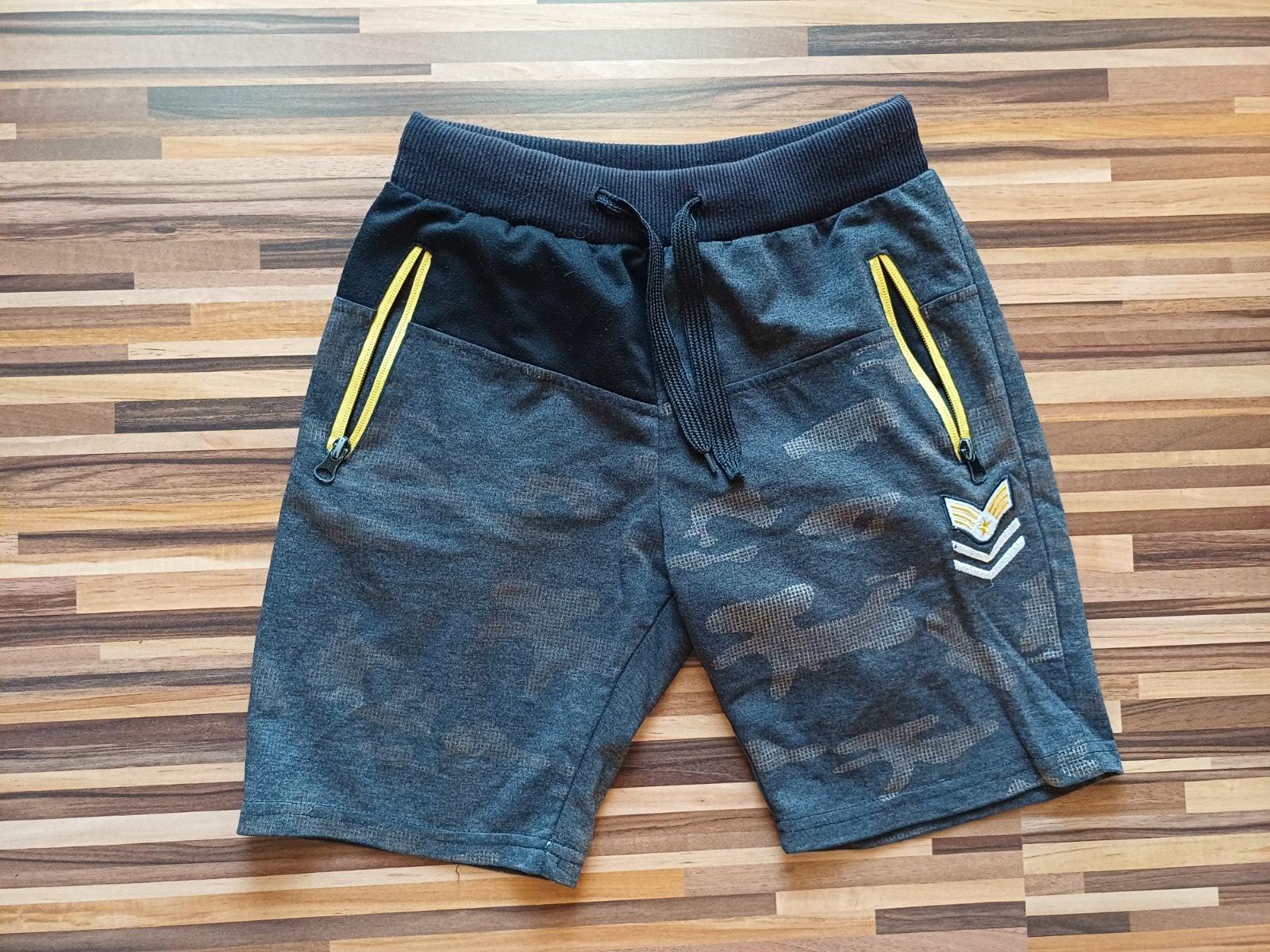 Šortky zn. Grace, veľ. 146. V páse šnúrka na stiahnutie, 2 bočné vrecká na zips. Farba čierna/sivá - maskáčový vzor. Materiál 90% bavlna, 10% polyester.