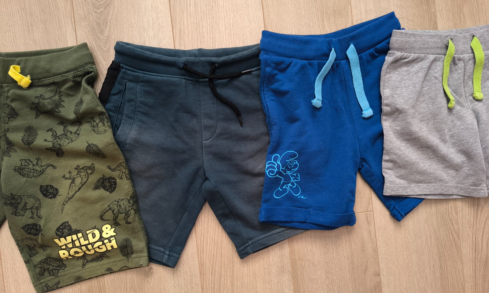 Šedé kraťasy nové (vzadu na vačku je obrázok šmolka)