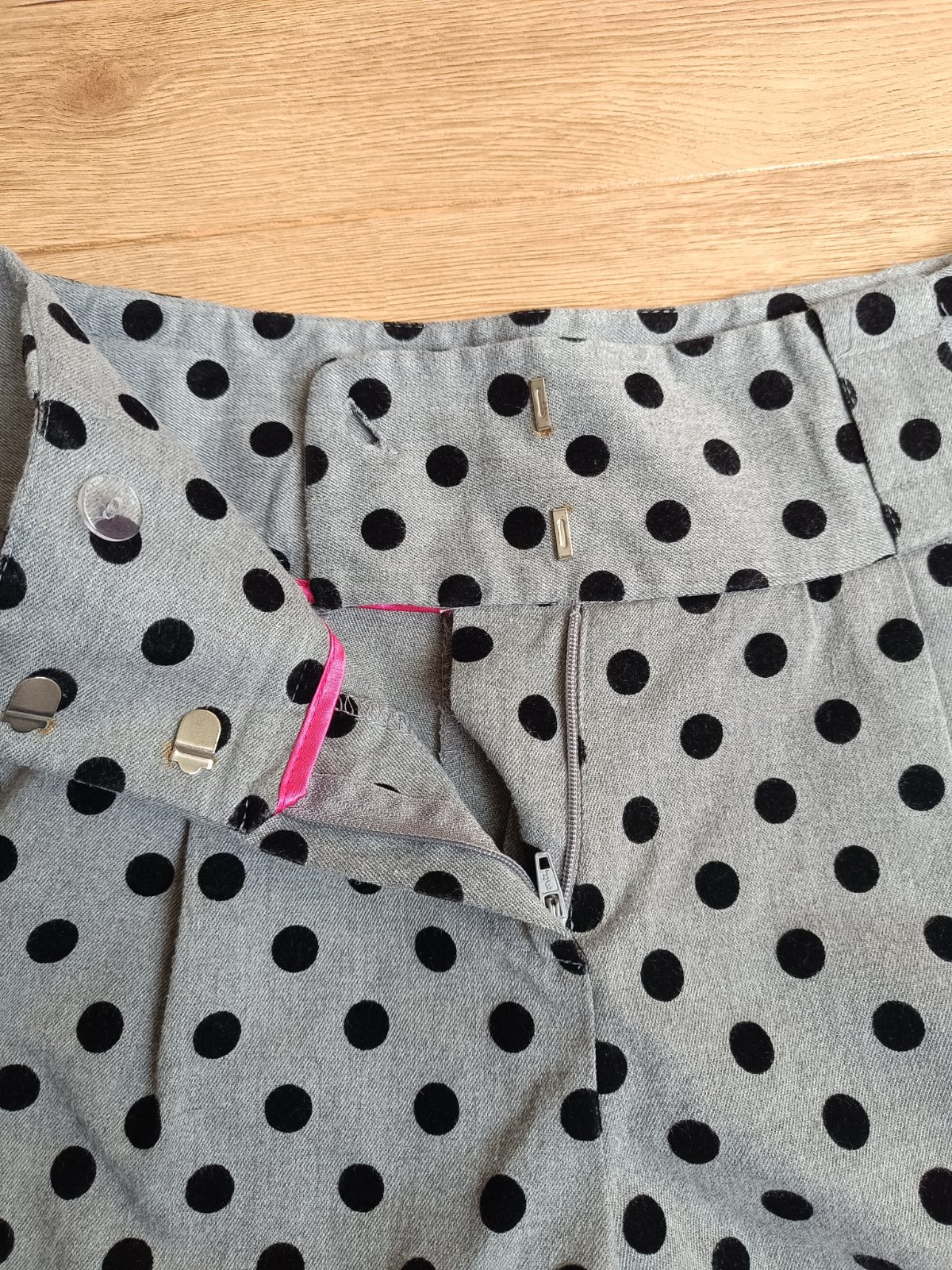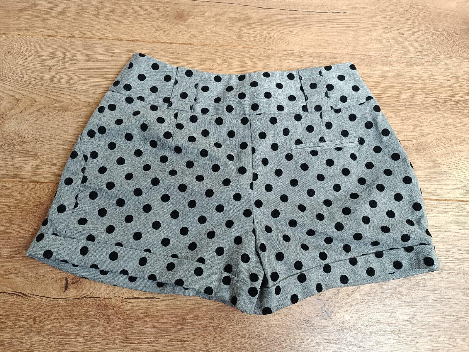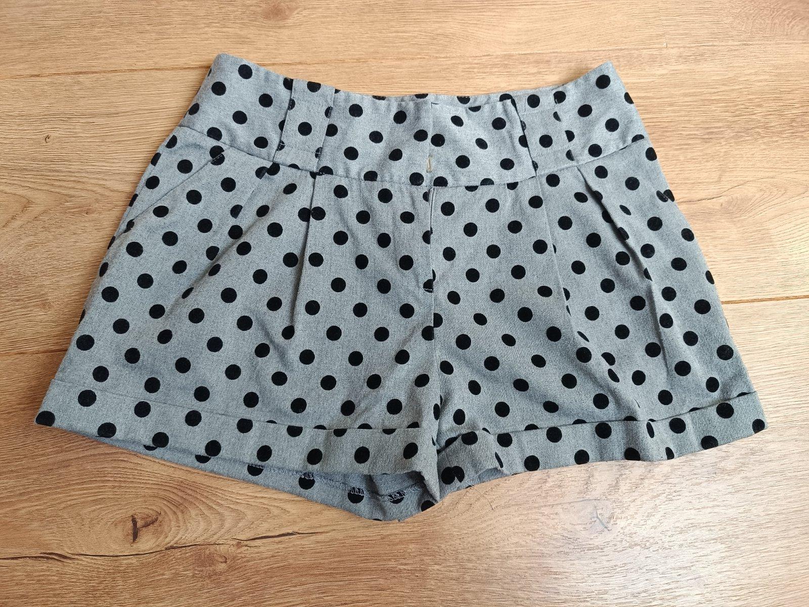 Par krat oblecene neposkodene damske hrubsie sortky, vyrobene z hrubsej bavlnenej latky v sivej farbe a ciernymi bodkami, so zapinanim na zips a haciky, s funkcnymi vreckami, vo velmi dobrom stave.