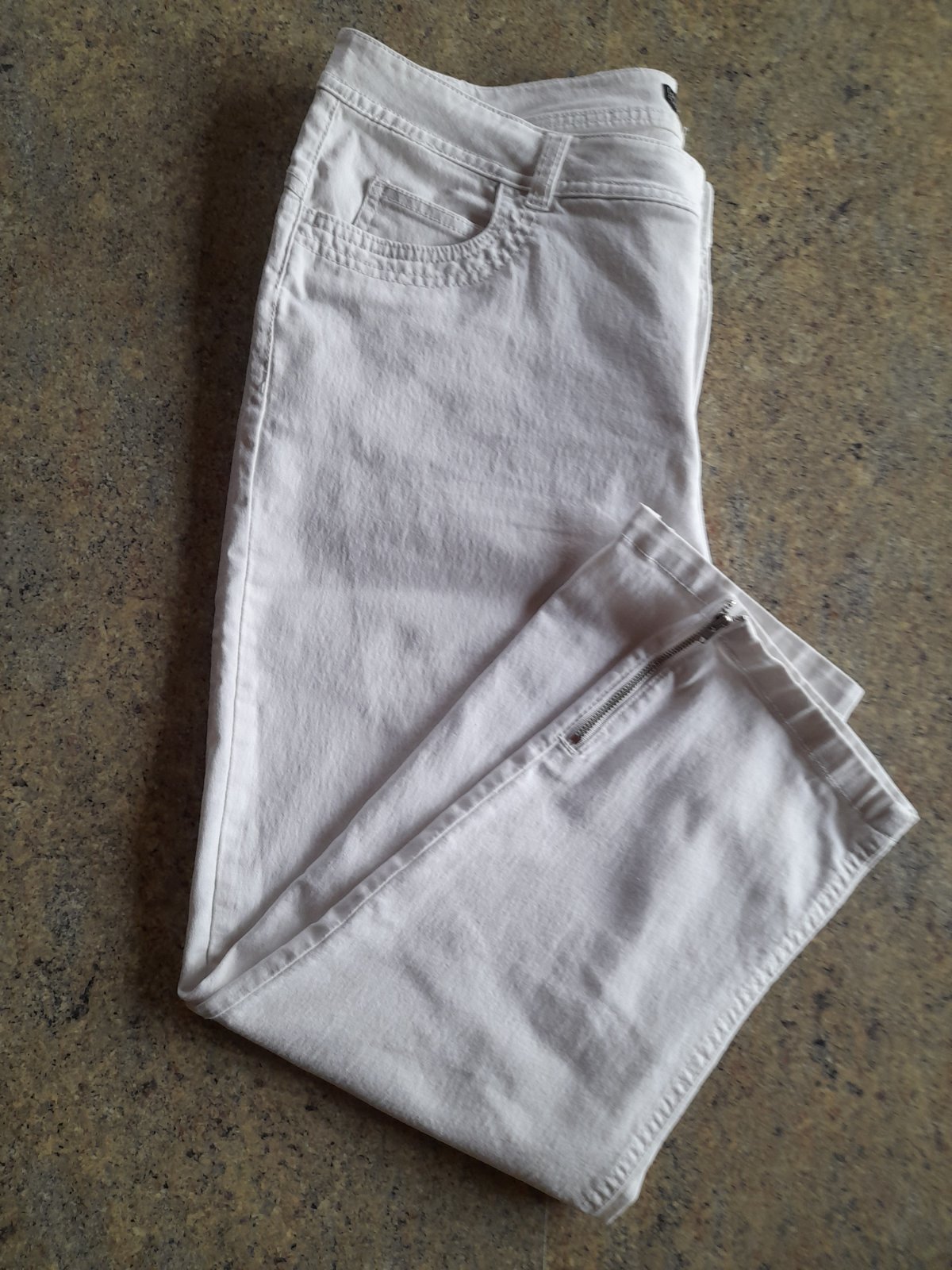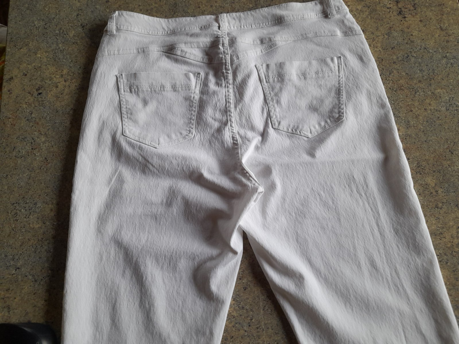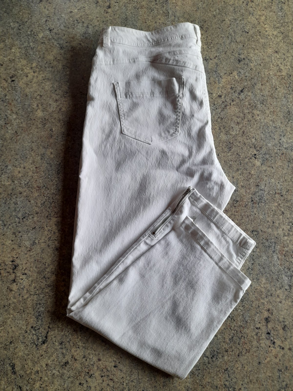 Predám capri nohavice bielej farby, značky F&F, veľkosť 46, príjemné, elastické. Nenosené, len oprané, mne už veľké. Pás: 2x45cm, povolí 2-3cm Boky 2x50cm Dĺžka 80cm