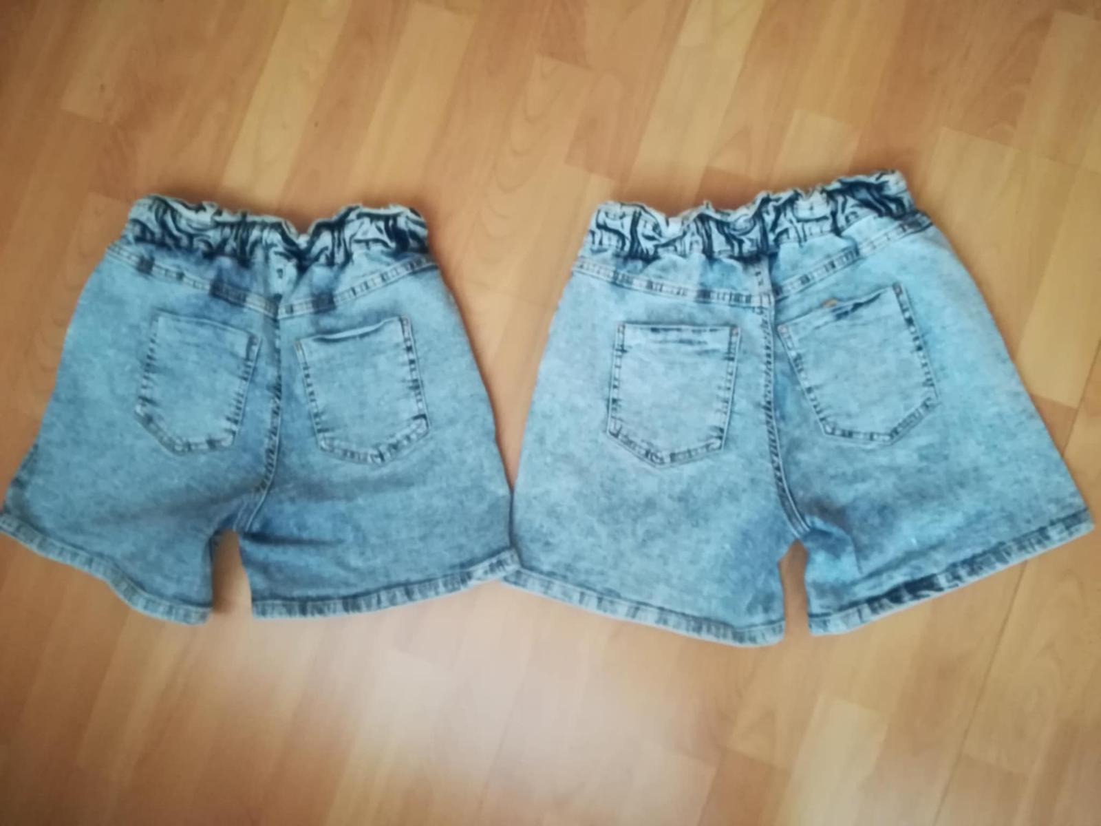 Elastické kraťasy s vreckami, vzadu gumička. V predu zips a gombík. Šírka v pase v kľude 31cm x 2, bočná dĺžka- 37cm. Bez poškodení.