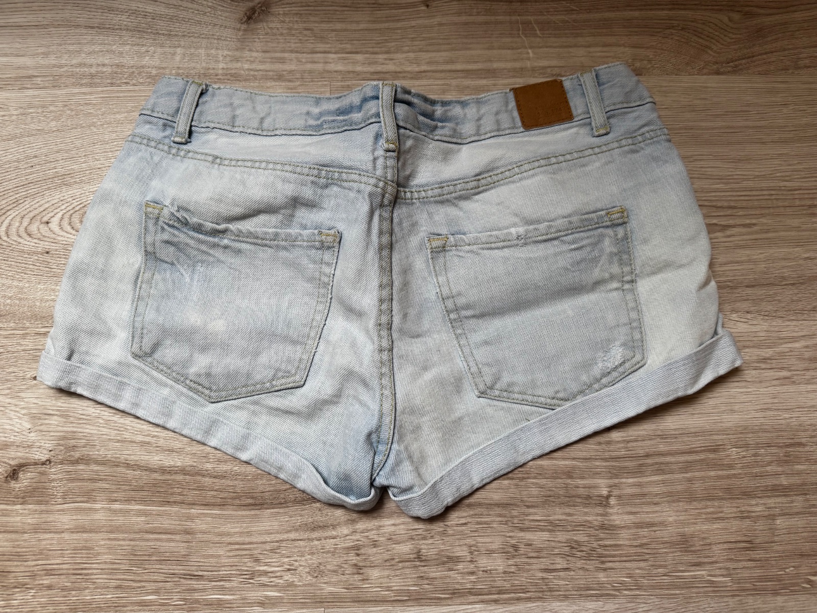 Kraťasy bledomodrej farby -veľkosť 34, pekne sedia na S -minimálne nosené, bez poškodenia/vady ROZMERY -celková dĺžka je 27cm -šírka pasu je 32cm, najviac sa pas natiahne na 40cm -predný sed je 2...