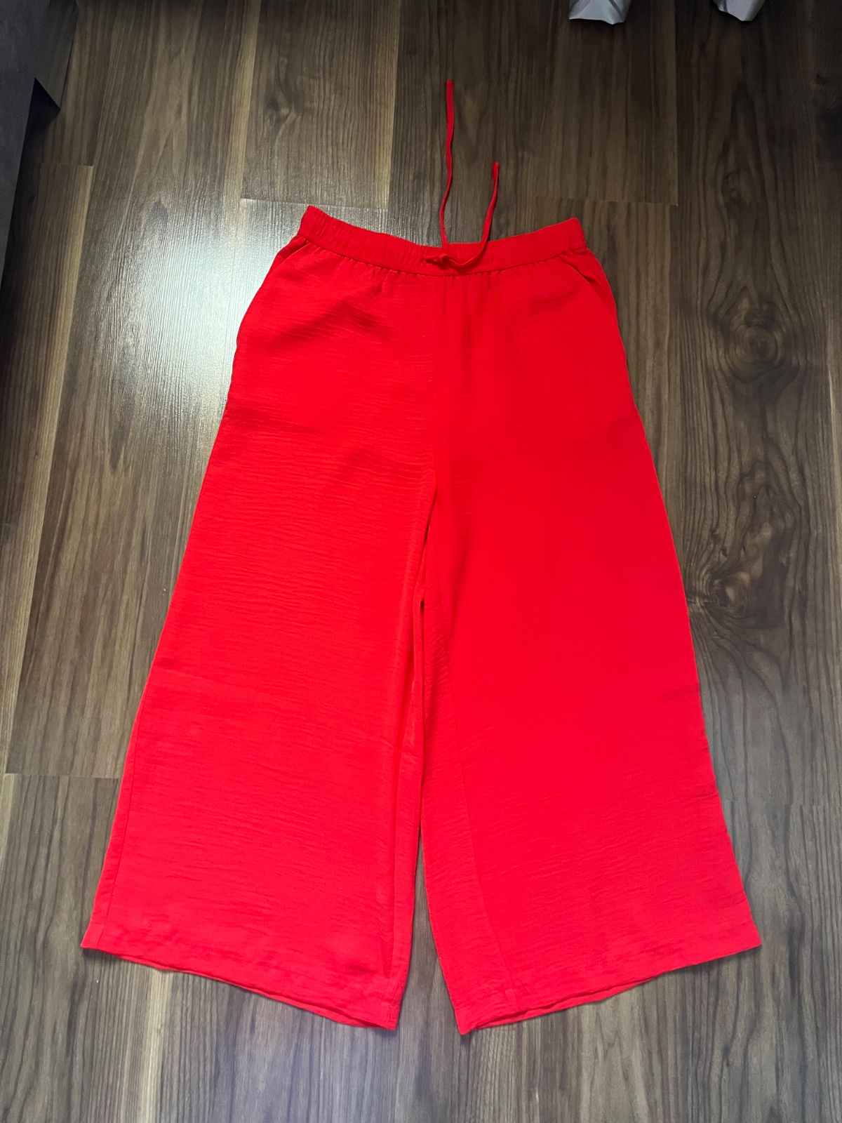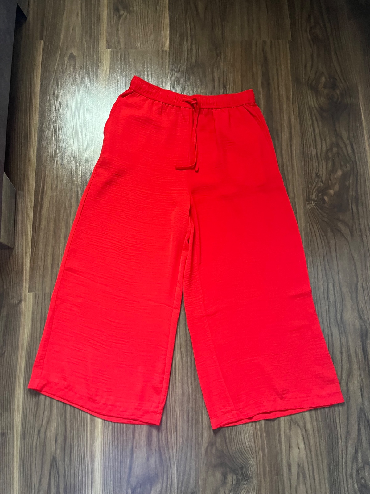 Pekné, ľahučké, sýtočervené, rýchloschnúce nohavice. Nie sú elastické, celková dĺžka 85cm. V páse 2 x 45 cm, pútka na opasok, šnúrka na stiahnutie v páse aj dole na nohách. Vpredu 2 x hlboké vrecko...