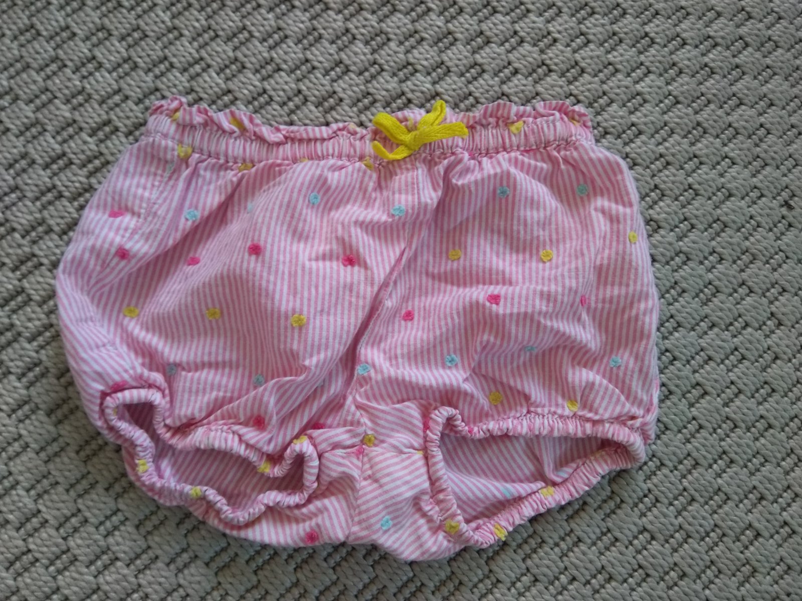 Ponúkam na predaj kraťasy zn. H&M (na vysačke veľ. 9-12mes - 80 - v skutočnosti veľmi štedrý strih, kľudne do cca 2,5r). Bez požkodenia. Materiál: Bavlna, Farba: Ružová s prúžkami a jemnými bodkami.