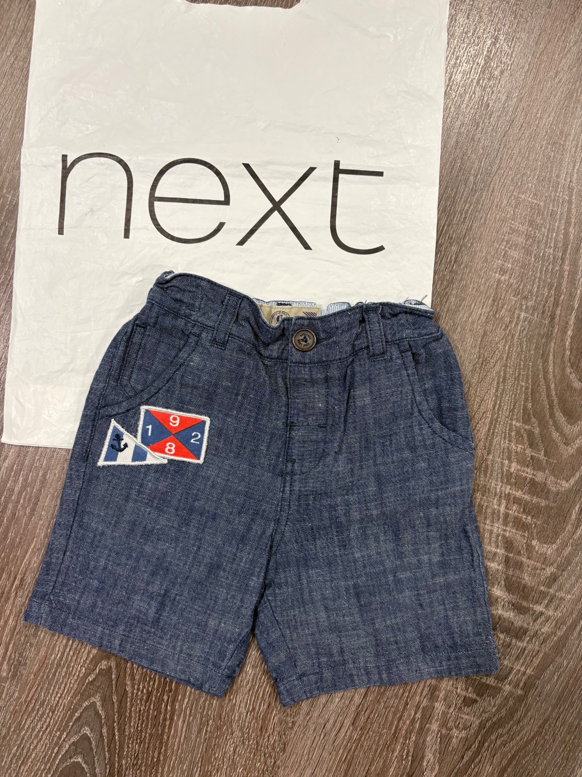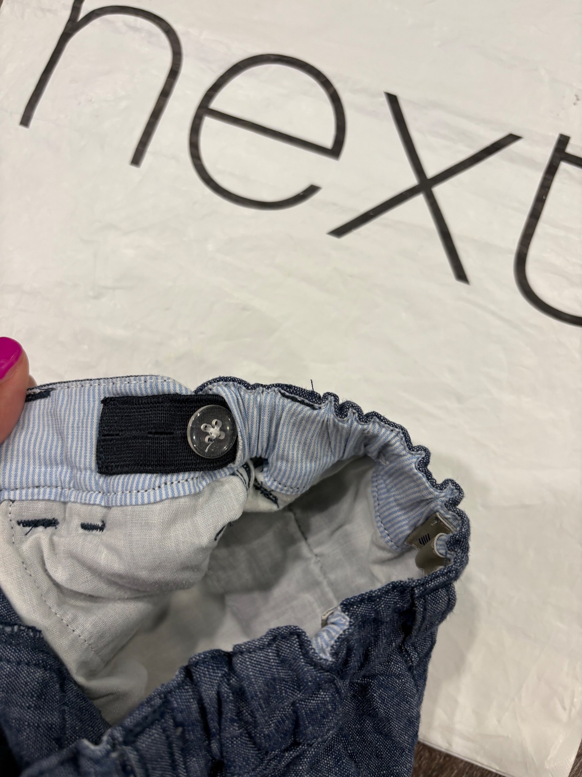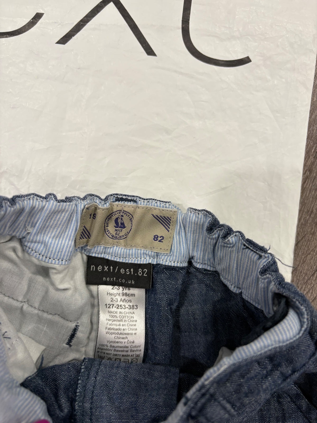 06.NEXT letné kratasy z makkej rifloviny, velkost je 98, bez poškodení, v páse je stahovacia gumka, dlžka je 27cm a širka v páse je od 22x2cm do 26x2cm