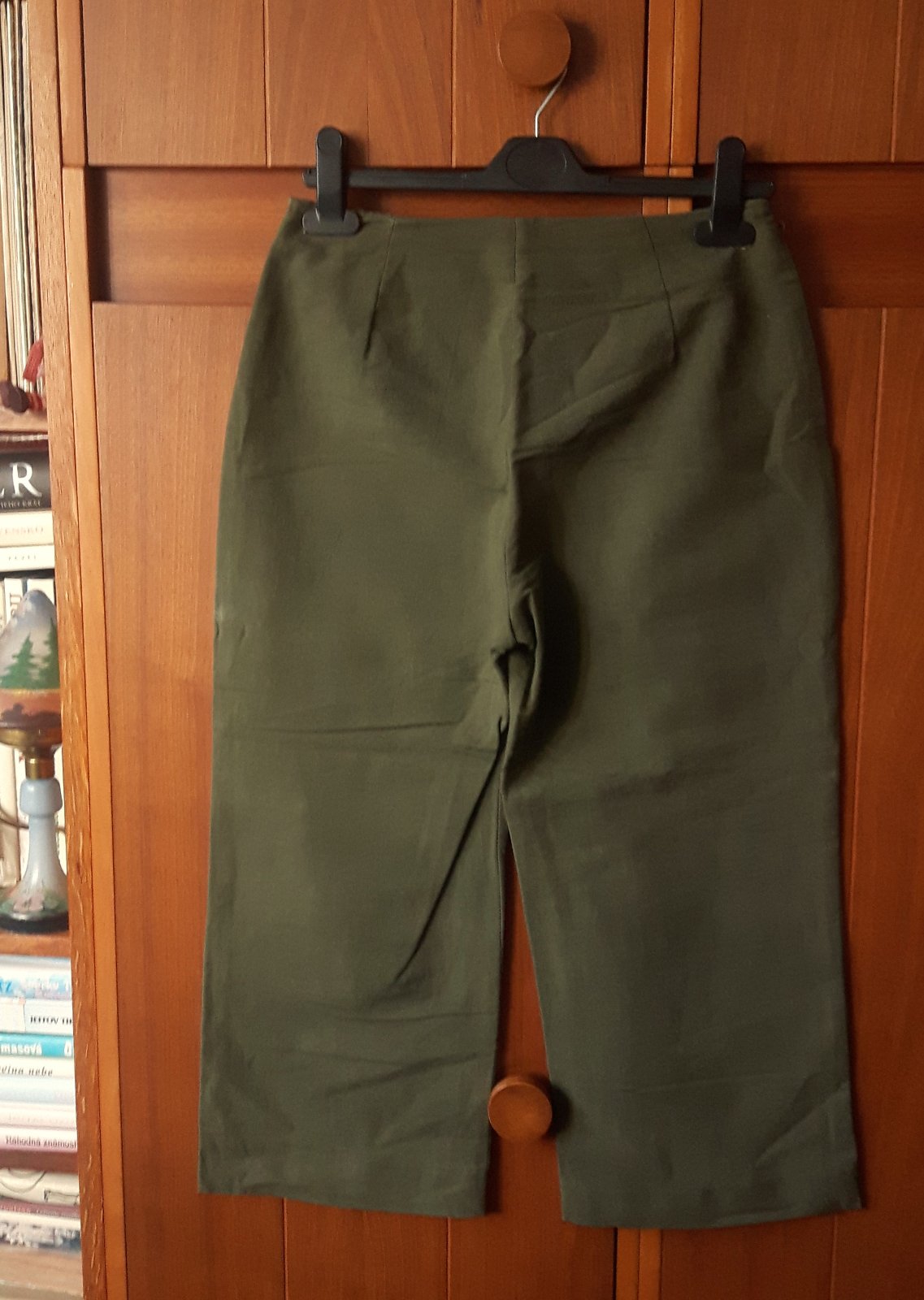 Príjemné bavlneno-ľanové 3/4 nohavice pod koleno zelenej / khaki farby. Dĺžka 74 cm, šírka v páse je 32 cm so zapínaním na zips na boku nohavíc. Bez poškodení! Veľkosť XS/S, zloženie: bavlna, ľan.