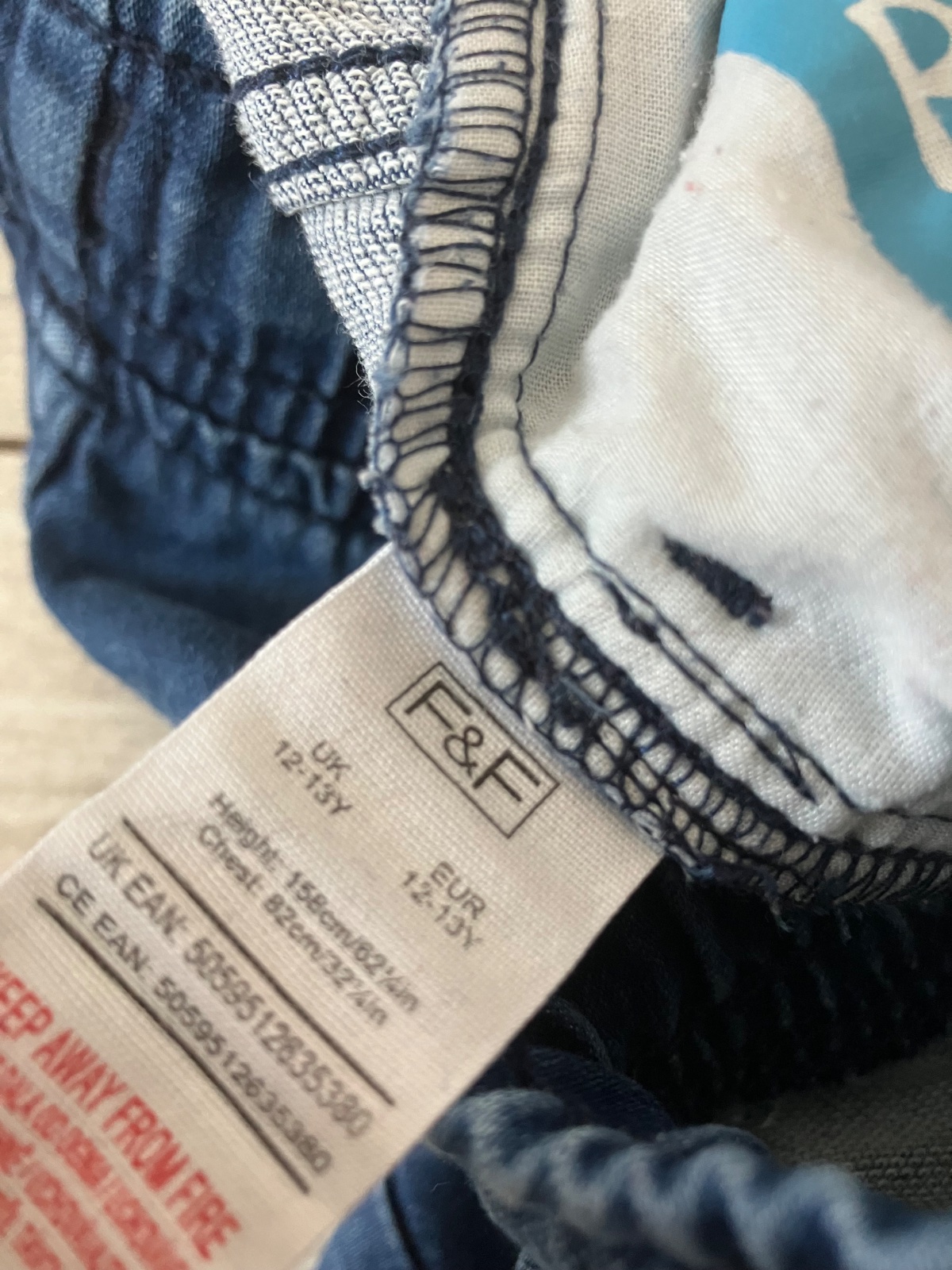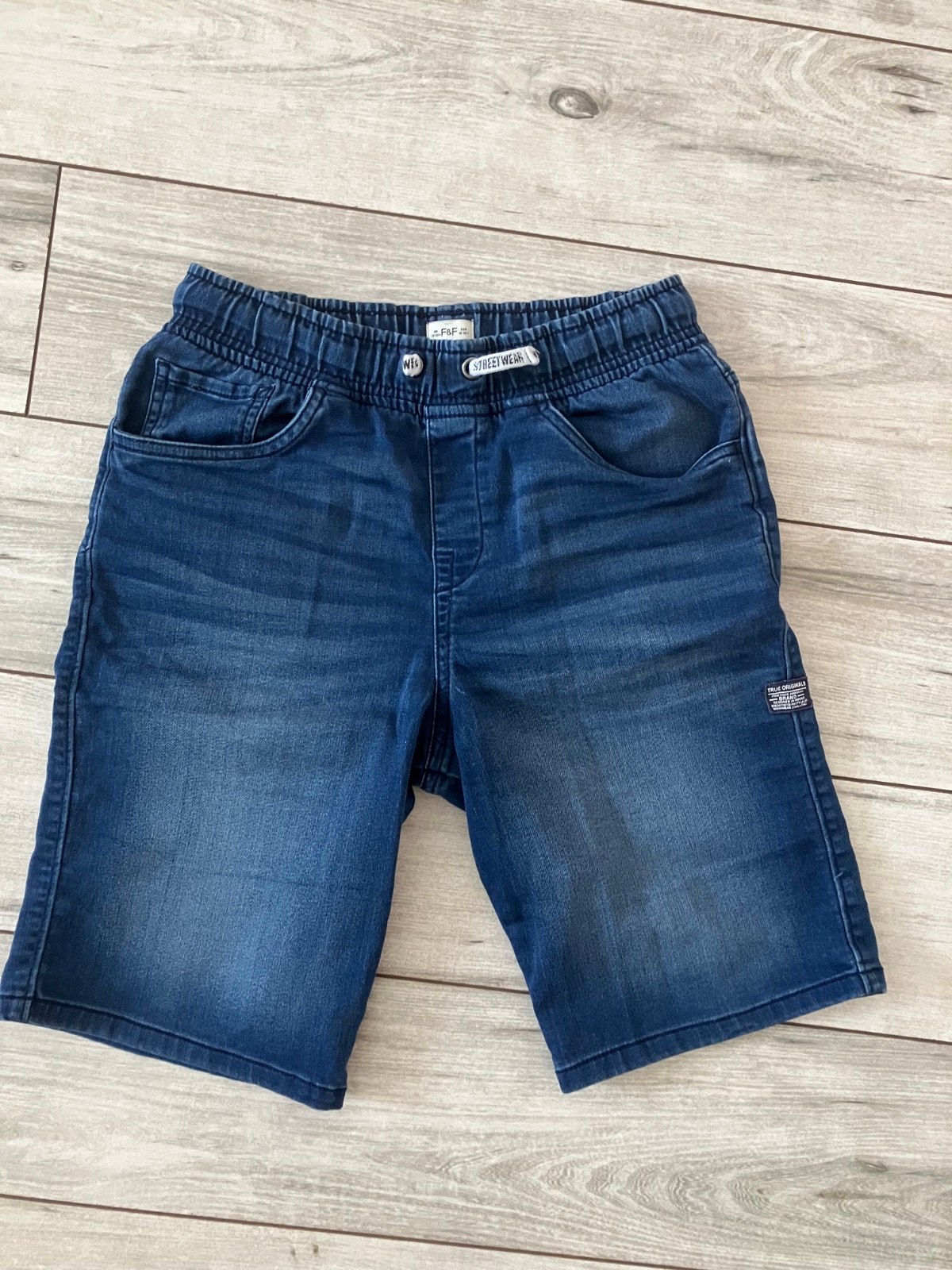 Rifľové kraťasy, na vek 12-13 rokov, Materiál 100 % bavlna, v páse sťahovanie na gumu, 100% stav bez poškodenia Rozmery: pás- 35cmx2, dĺžka 49cm, šírka cez boky 44cmx2