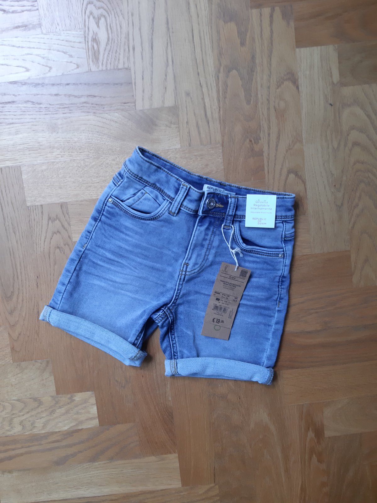 Mäkké, elastické šortky z tenkej dzinsoviny. Vnútri nastaviteľný pás na gombíky. Gombík na zapinanie je zacvakávací. Dostali sme do daru, synčekovi nesedia, je príliš štíhly v páse.