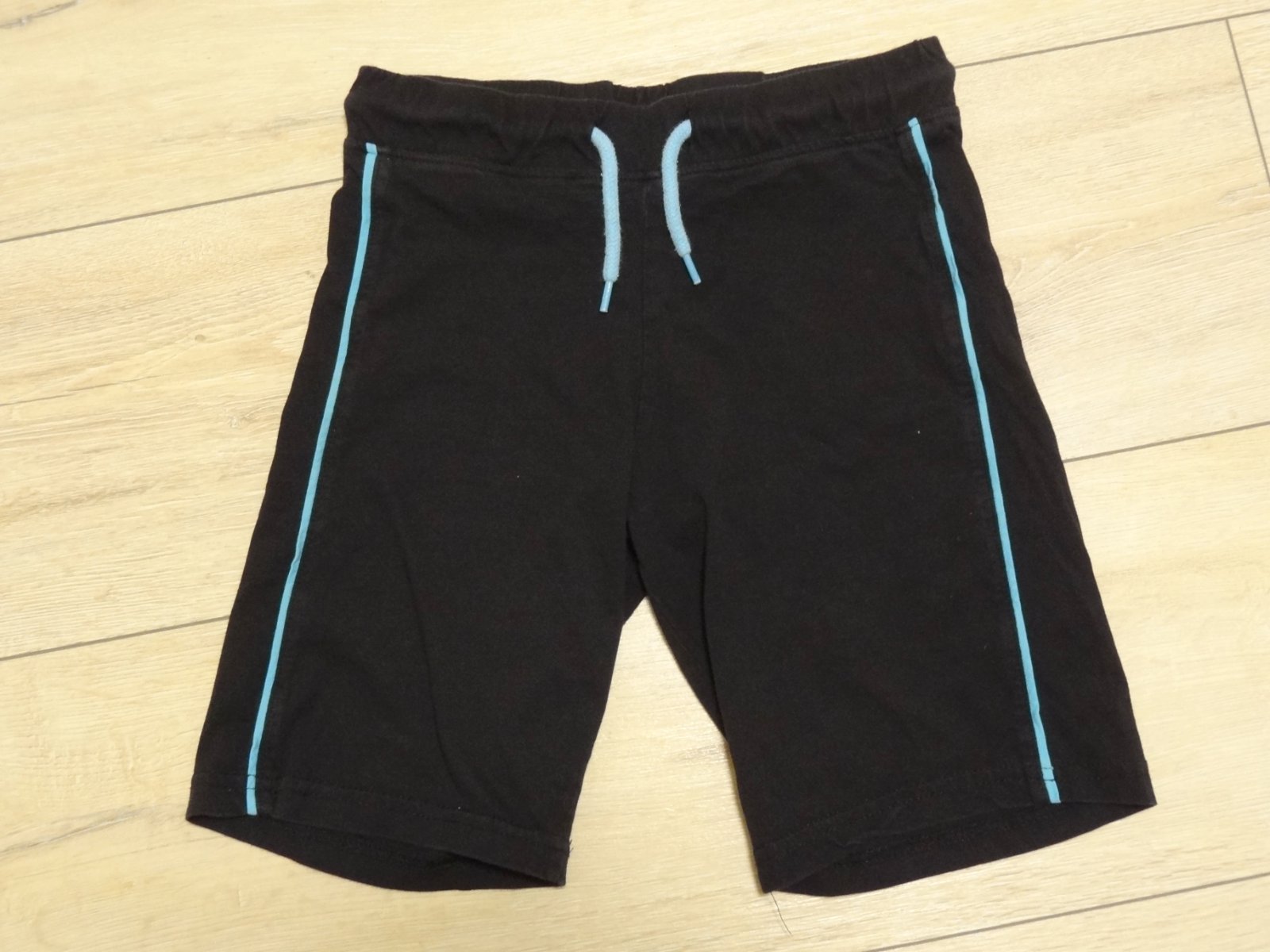 čierne kraťasy s modrymi pásikmi a šnúrkami, bez poškodení, 100% bavlna, značka: DOPODOPO, veľ. 122 - dlžka 36 cm, šírka v páse 28 -35 cm sa natiahnu