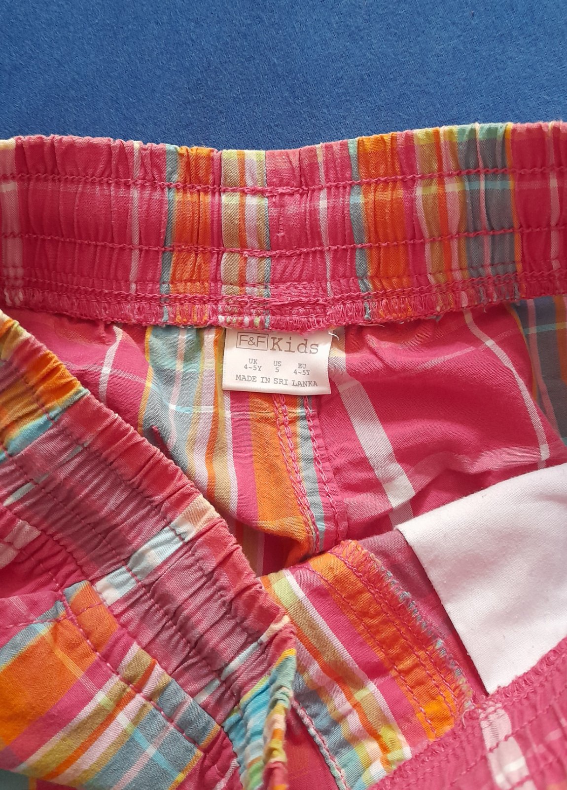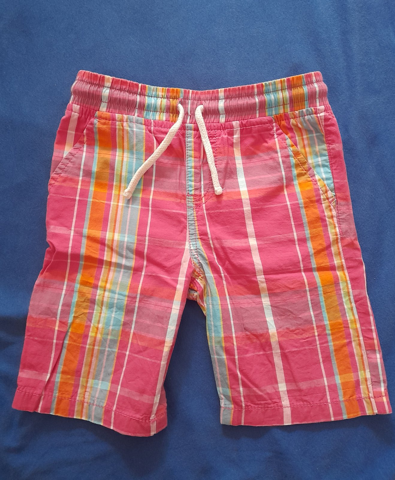 Tenké plátené kraťasy zo 100% bavlny. Vnútorná dĺžka cca 14 cm, celková 34 cm. Pás v kľude 26,5 cm, natiahne sa na max 31 cm. Funkčná šnúrka aj vrecká.