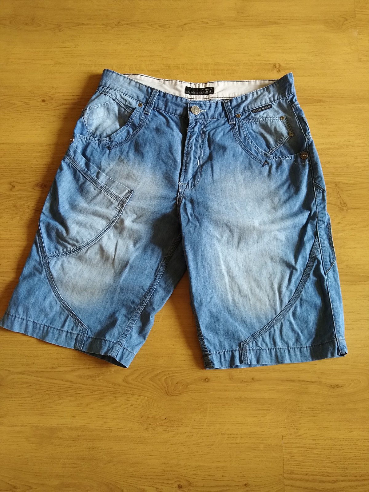 TOP stav, dĺžka kúsok nad koleno pri výške 180 cm. Majú rifľový vzhľad, ale je to mäkší pohodlnejší vzdušný materiál. "Vyšúchaný vzhľad" je originál.
