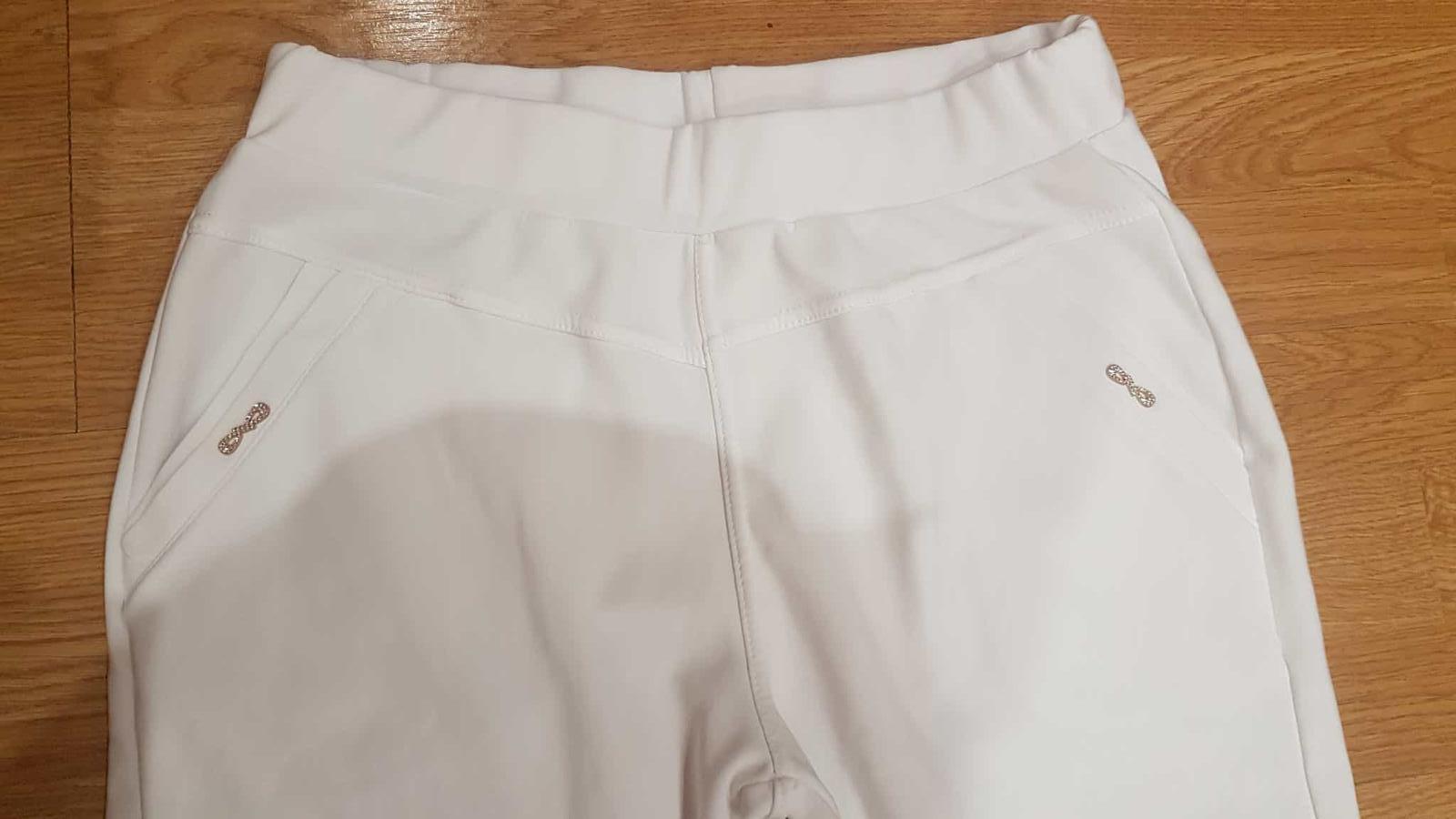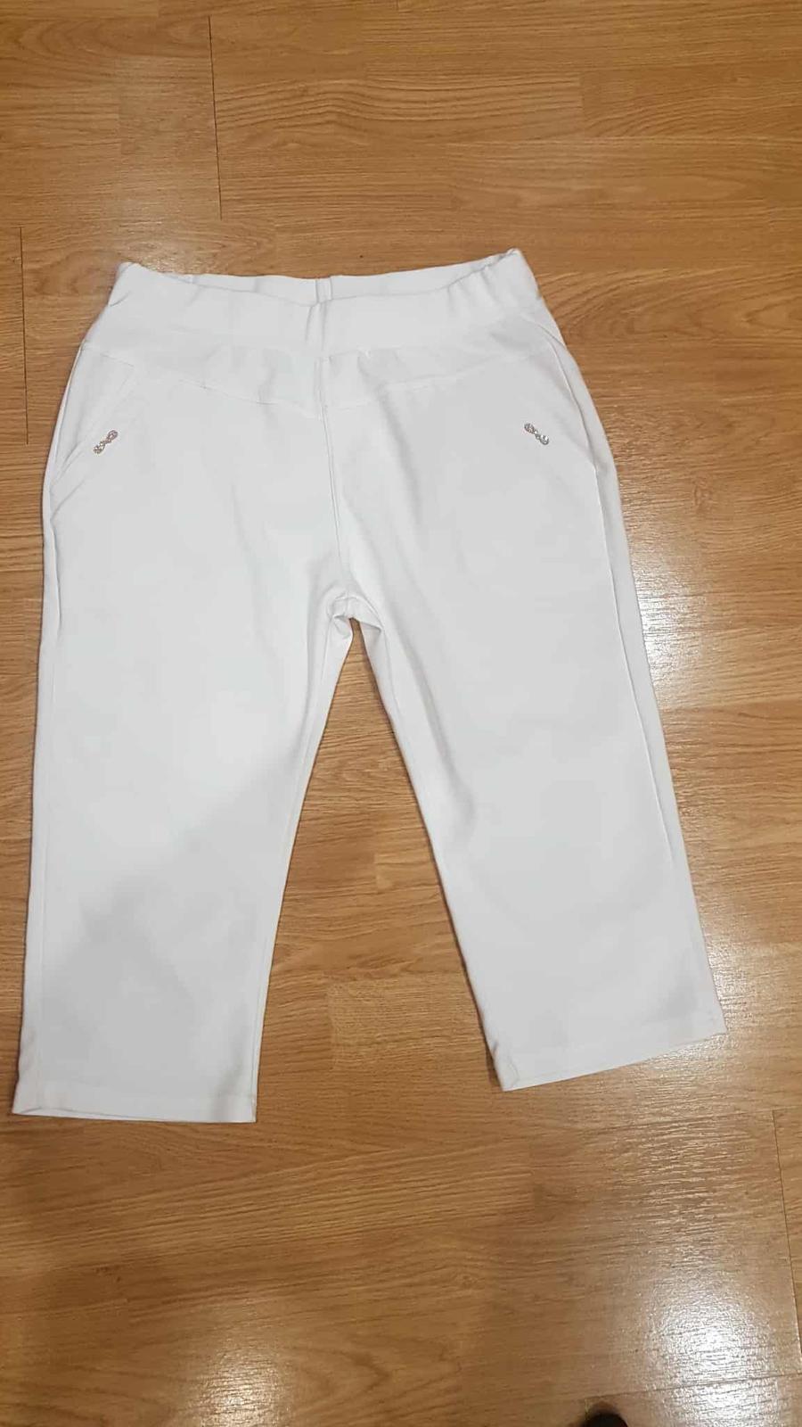 Pekné elastické 3/4 nohavice, v páse guma, sú snehovo biele. Po bokoch vrecká, v zadu vrecká. Veľkosť je písaná 2 až 3 xl, ale to nesedí. Rozmery sú nasledovné - pás 37 x 2 cm, natiahne sa do 57 x 2 cm. Celková dĺžka je 70 cm.