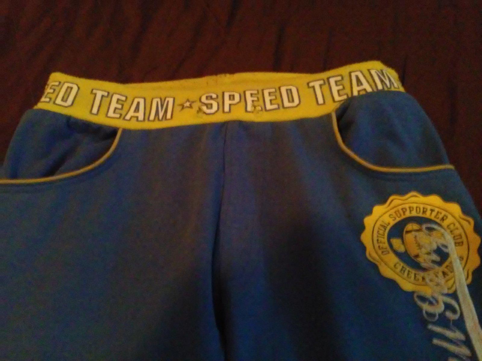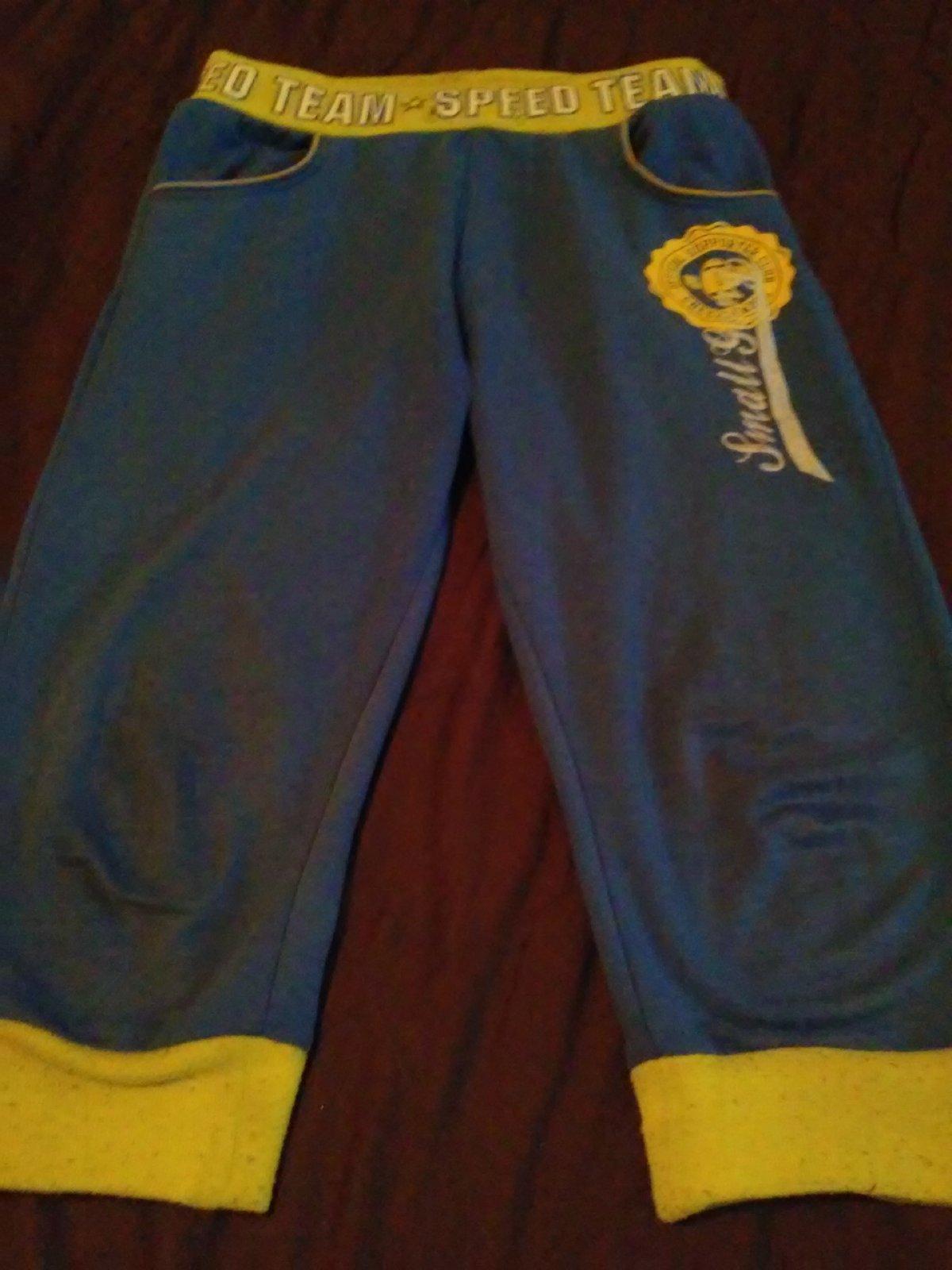 Predám pekné tepláky. Tie žlté patenty a nohách a okolo pása sú trocha ožmolkované, chýba mašlička v páse, ale inak nevidím poškodenie. Veľkosť je na nich uedená 14.