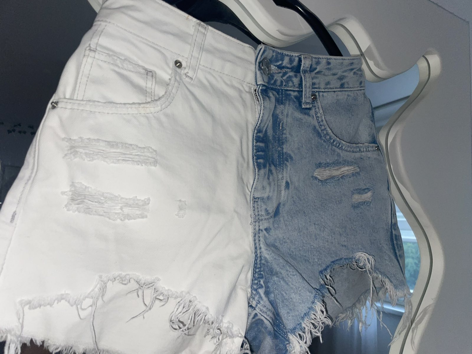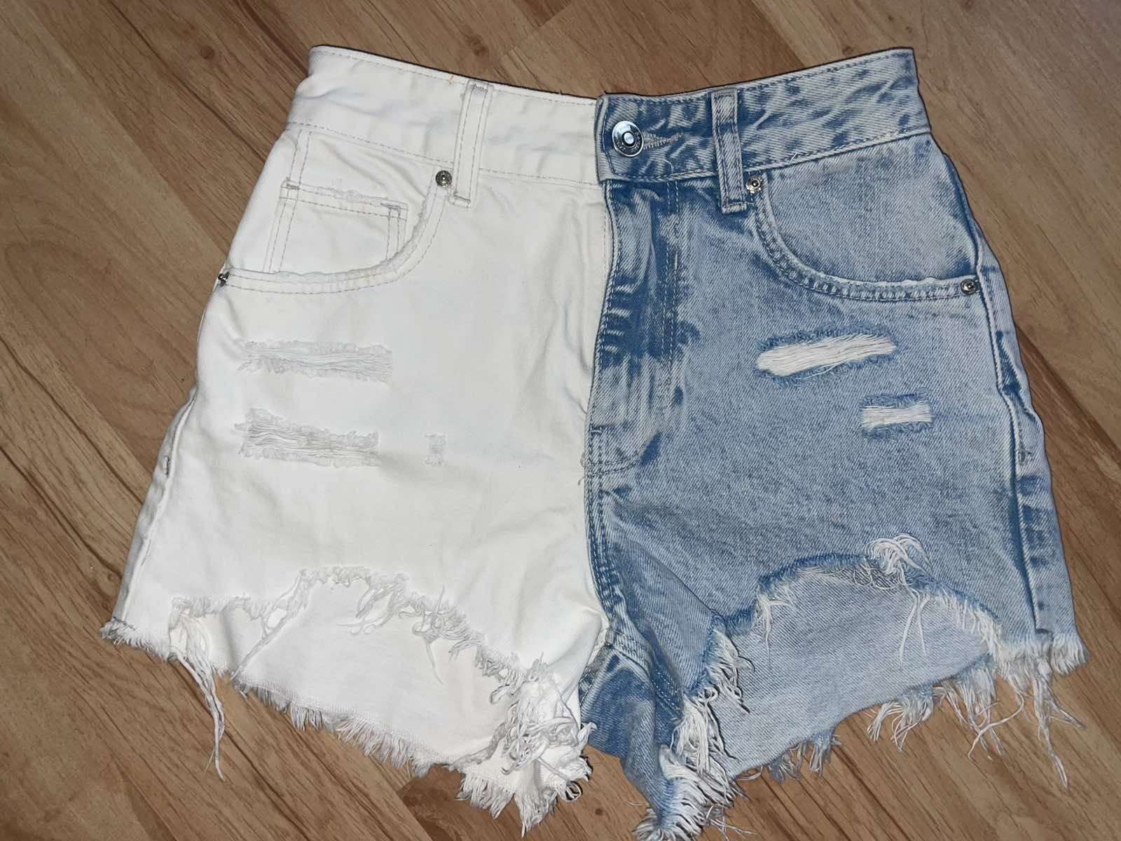 Výborný stav, riflové, bielo-modré, odstrihnute štítky, sedia na veľkosť 32, nepruzia,vysoký pás, pás 31 cm, predný sed 27 cm