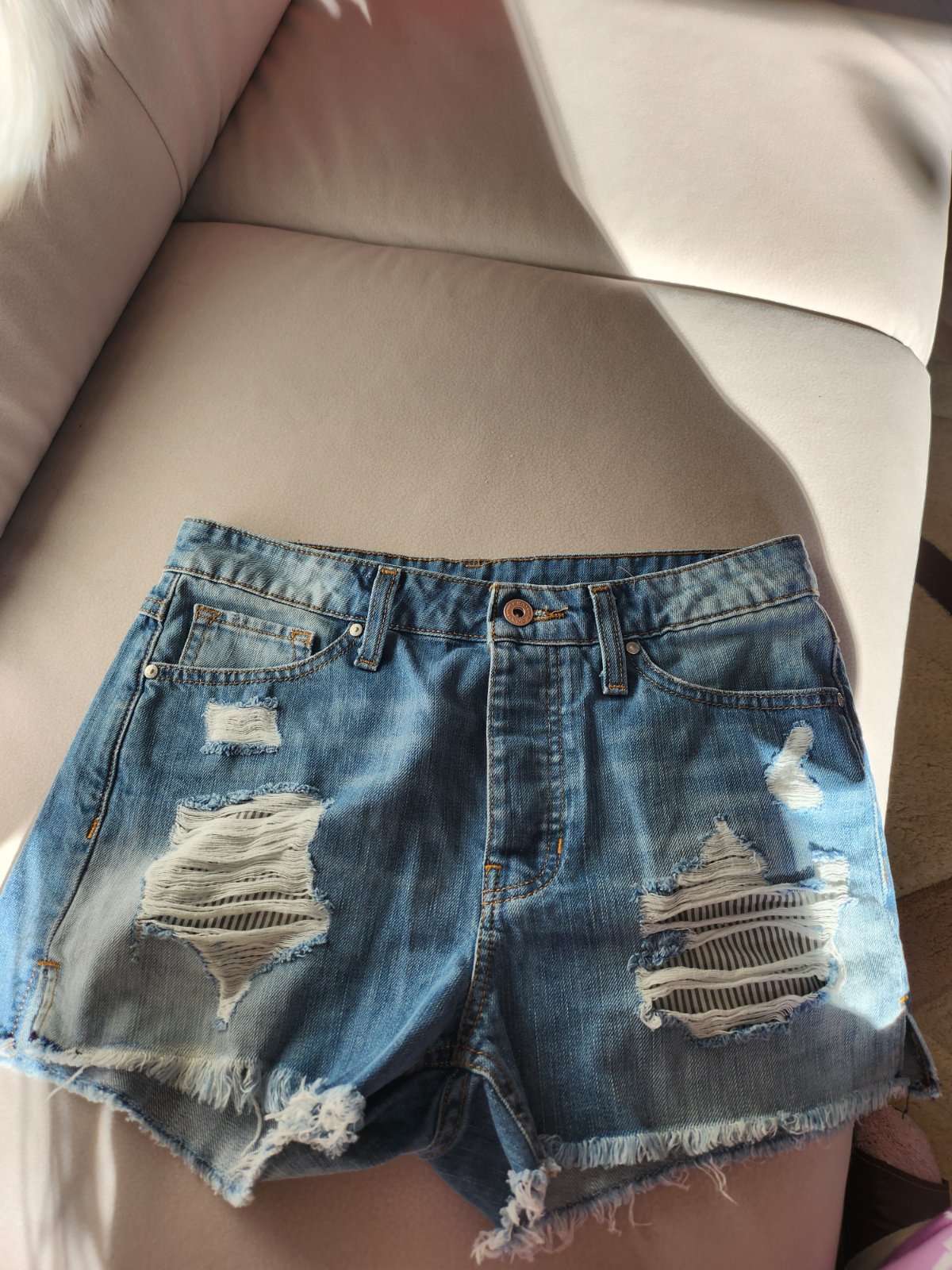 Šortky darujem za nákup. Veľkosť píše 8, to je tuším S. Obvod v páse 39cm x 2. Riflovina pevná.