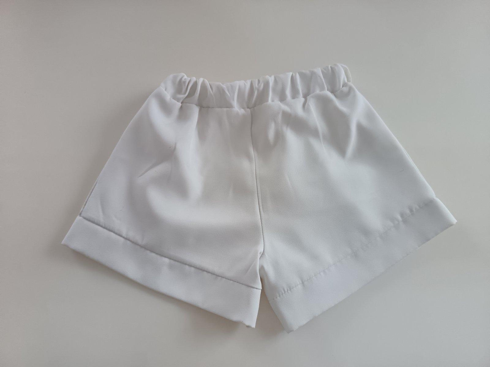 Biele látkové kraťasy, v páse na gumičku, plus putka na opasok, veľkosť písaná 8r.,ale kľudne premeriam, bez poškodenia