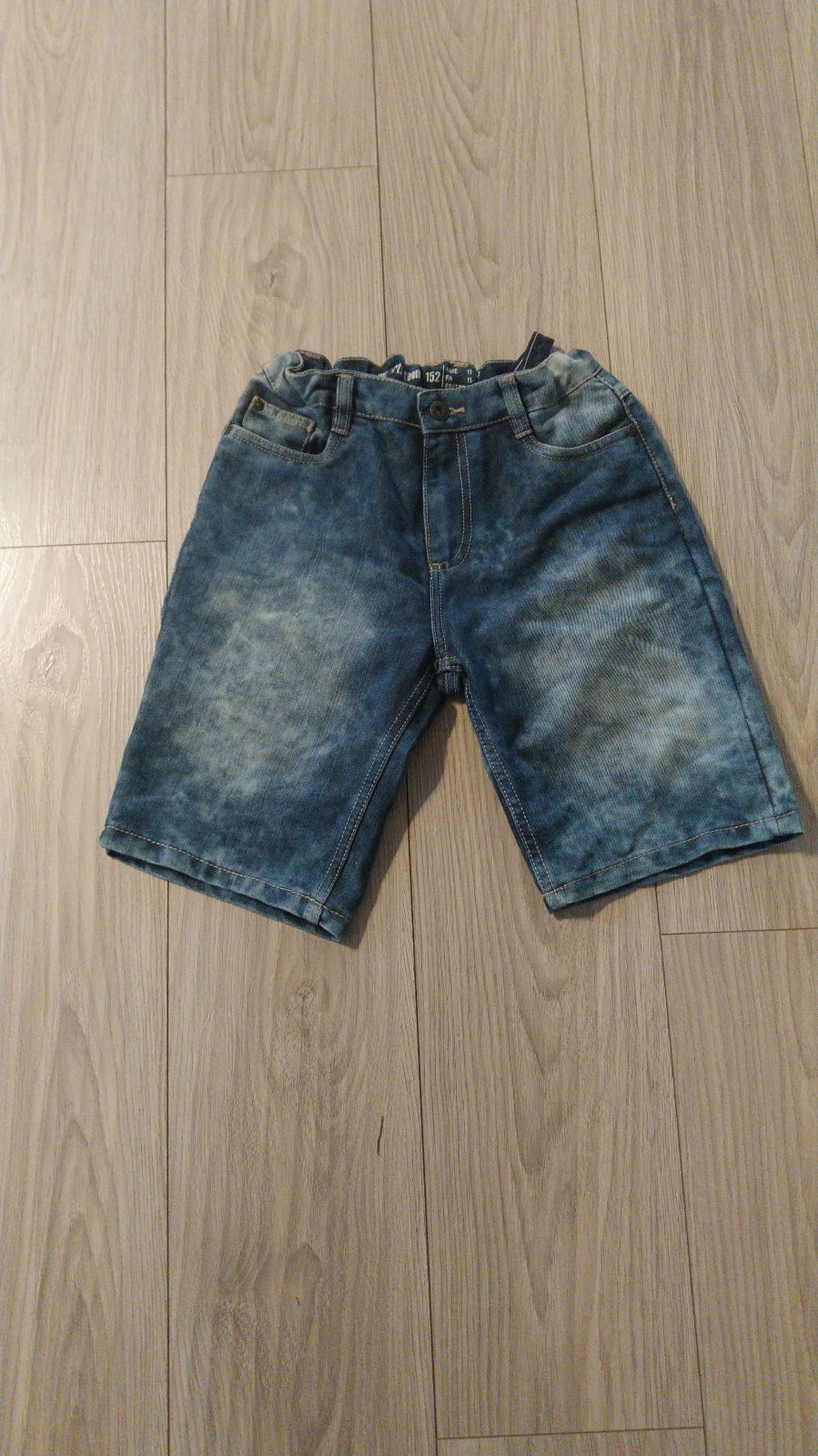 Riflové krátke nohavice, značka Pepperts, veľkosť 152. 2 bočné a 2 zadné vrecká. Šírka v páse 34cm, pás sa dá regulovať. Celková dĺžka 43cm, dĺžka od rozkroku po spodok 24cm.