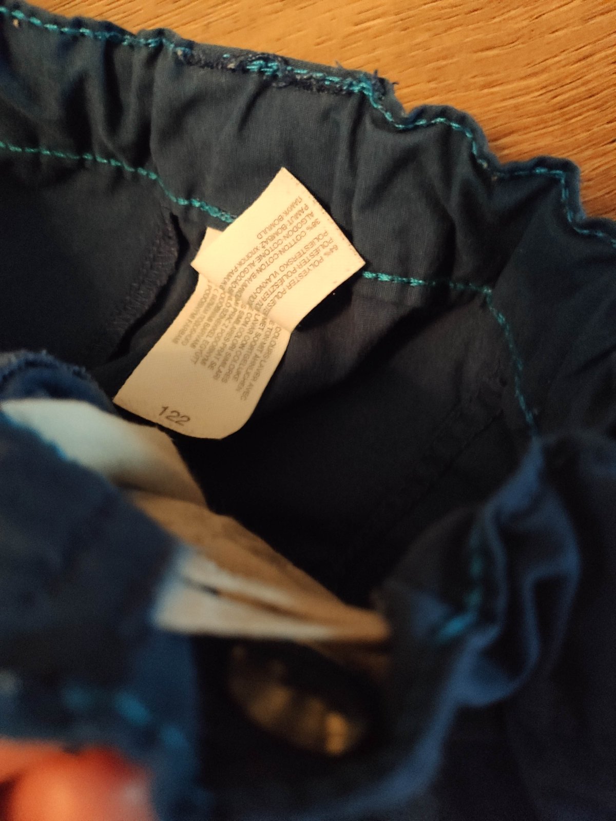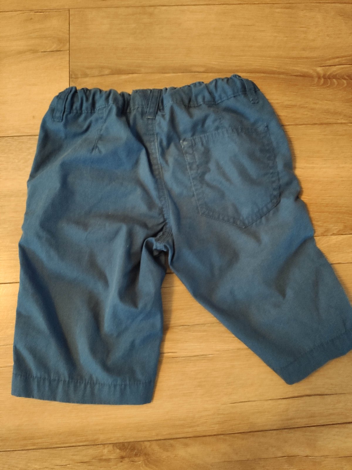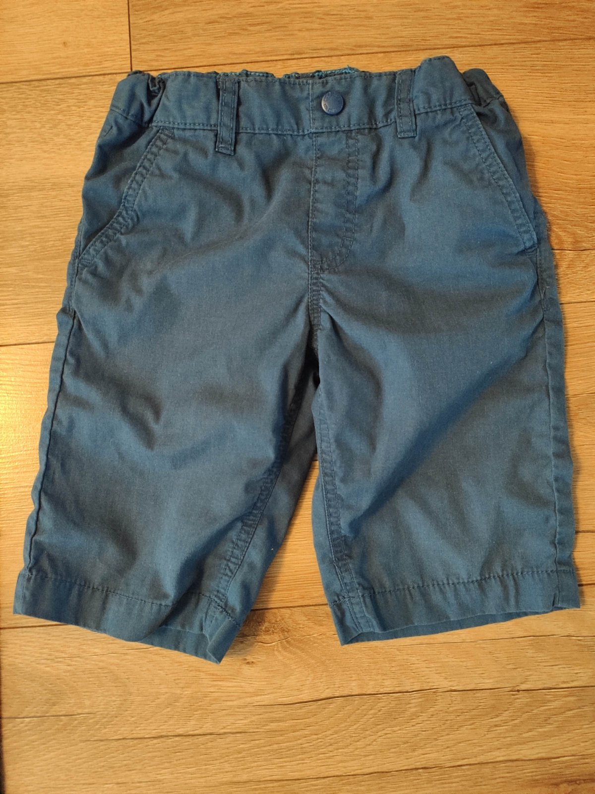 Tmavomodré dlhšie kraťasy ku kolenám, regulovateľný pás, bez poškodení.