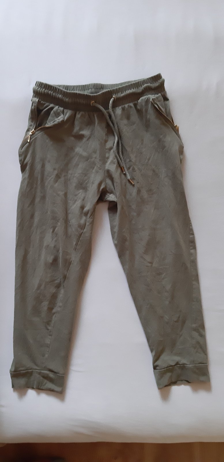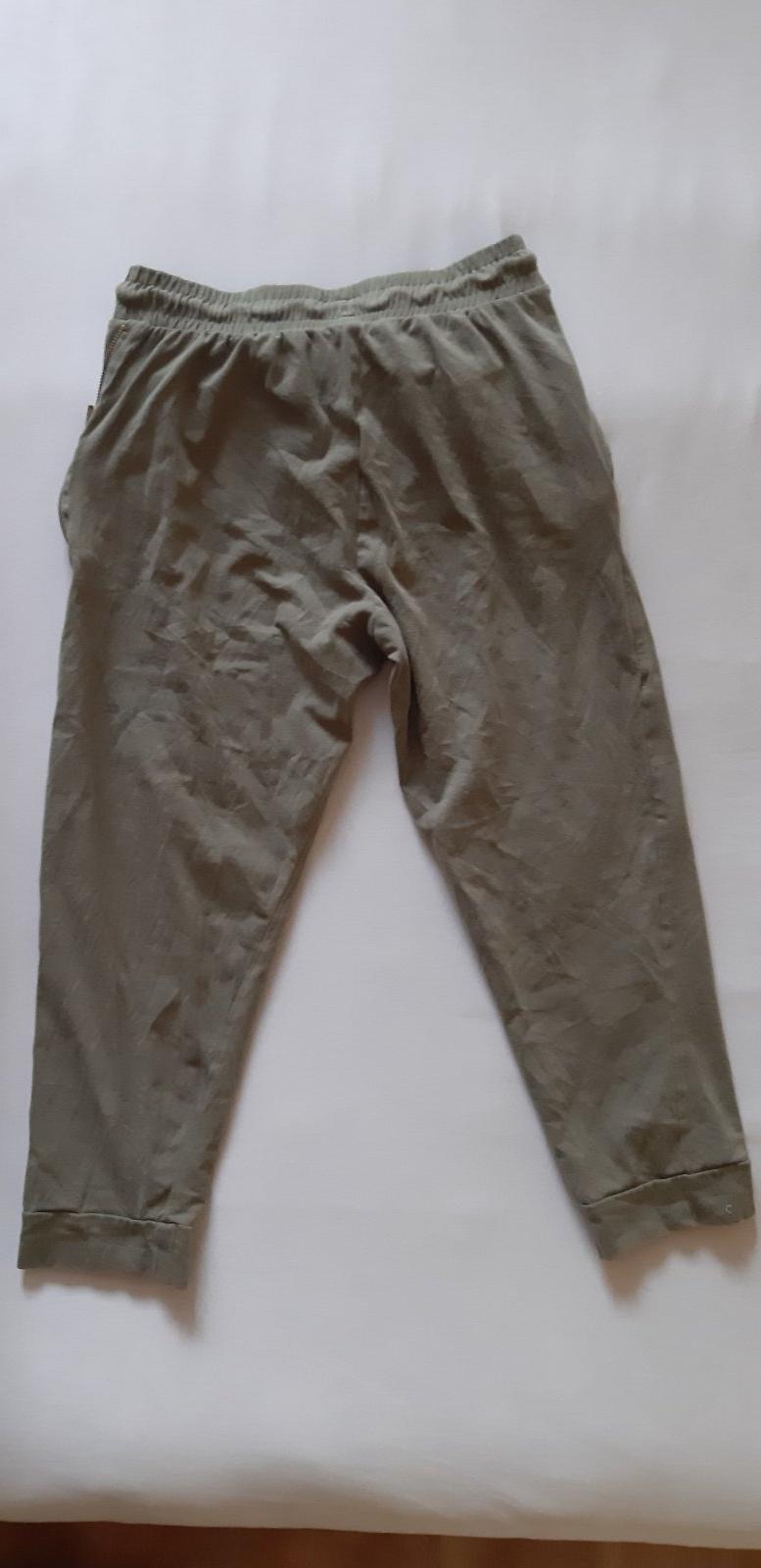 Nosené. Veľmi dobrý stav. 95% bavlna 5% elastan, v páse na gumu aj šnúrku, na vreckách zips. Dĺžka 80 cm, pás v kľude 31 cm, max 40 cm. Cena 5 EUR + poštovné.