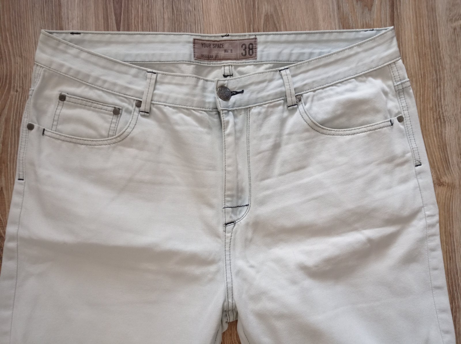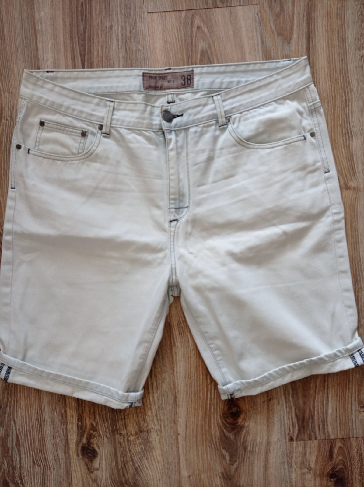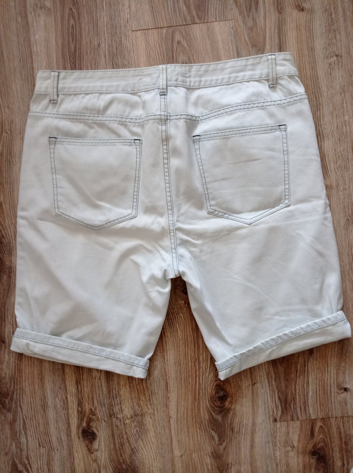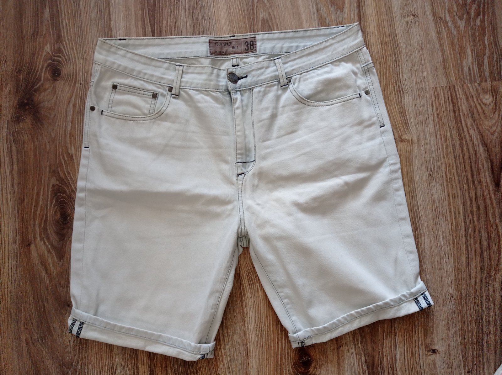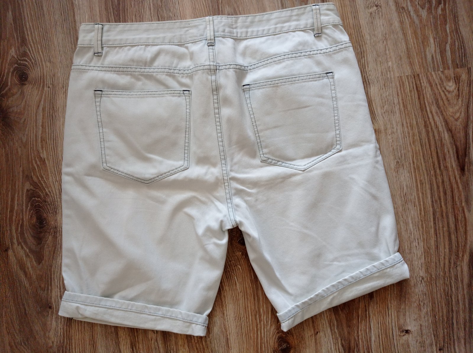Kraťasy sú nové bez visačky, z príjemnej svetlej rifľoviny, strih regular fit, dajú sa vyhrnúť podľa potreby. Veľkosť W 38, myslím, že L/XL, premerajte, pás 49 cm x 2, celková vonkajšia dĺžka 56 cm, vnútorná dĺžka 27 cm.