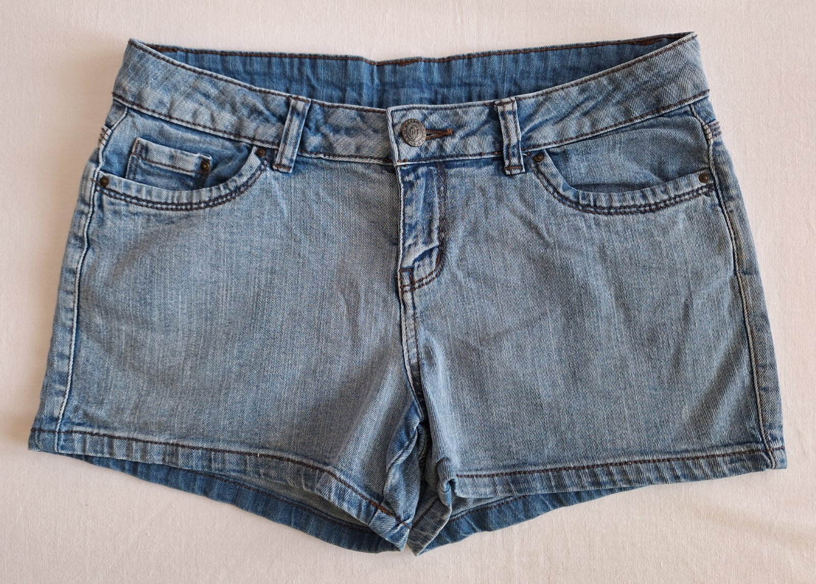 Velmi pohodlne rifle šortky Esmara 1 krát oblecene. Veľkosť 40 Bledomodrá farba s presuchanim Dĺžka 27cm Pas 43-45cm x 2 Boky 51 x 2
