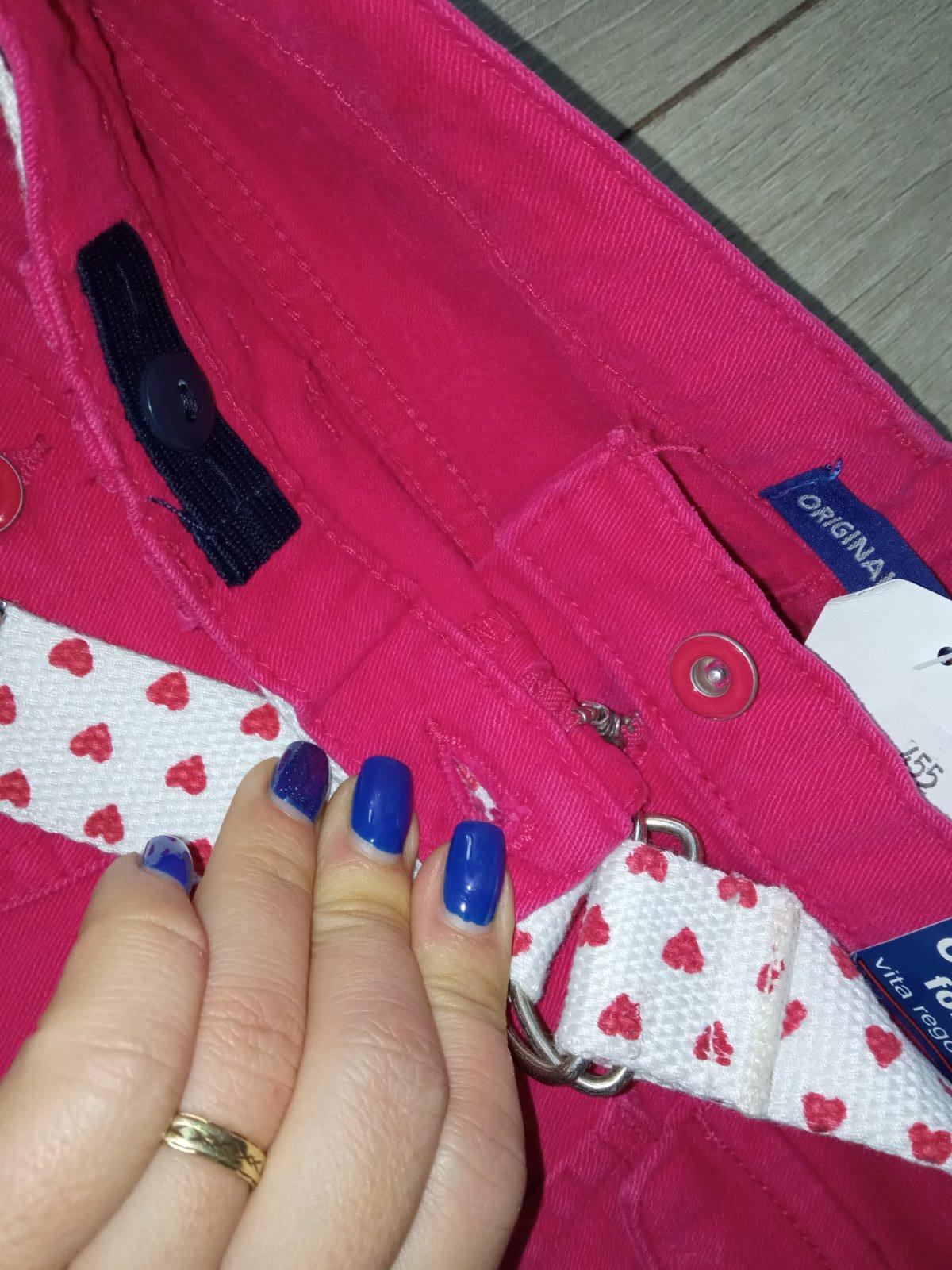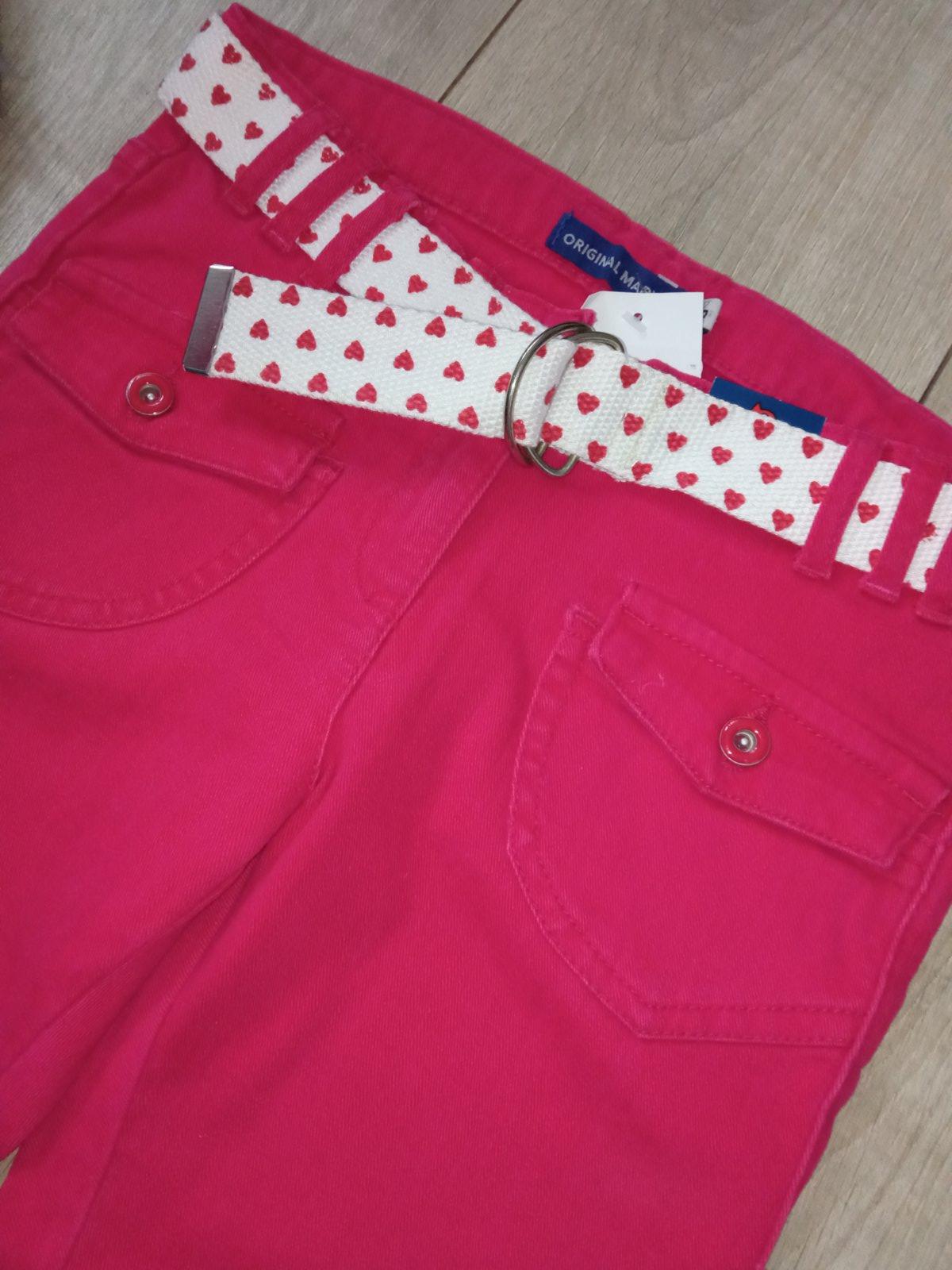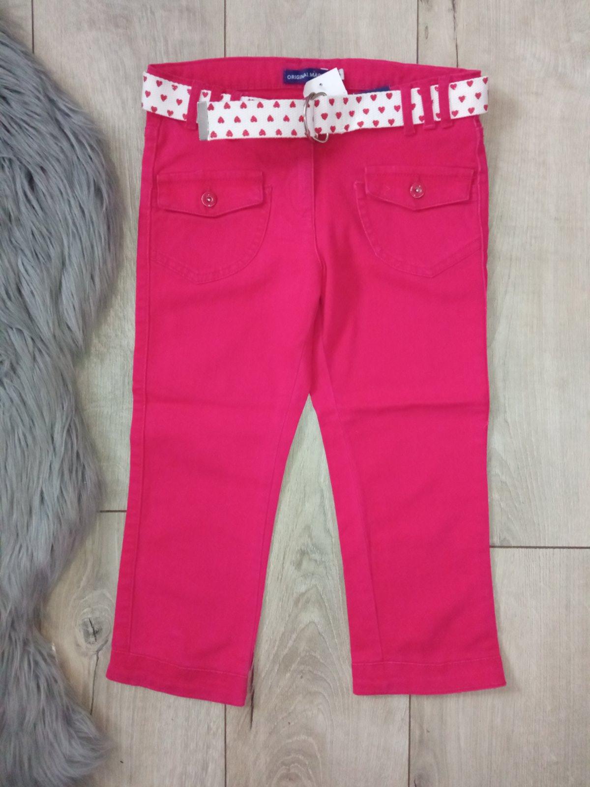 Dievčenské trojštvrťové rifle značky Original Marines, tenké, jednofarebné, so zapínaním na gombík a zips, dve predné vrecká a dve zadné vrecká, pútka na opasok, nie sú elastické, farba: tmavoružová. Majú nastaviteľnú gumu v páse. Materiál: 98% bavlna,2% elastan.