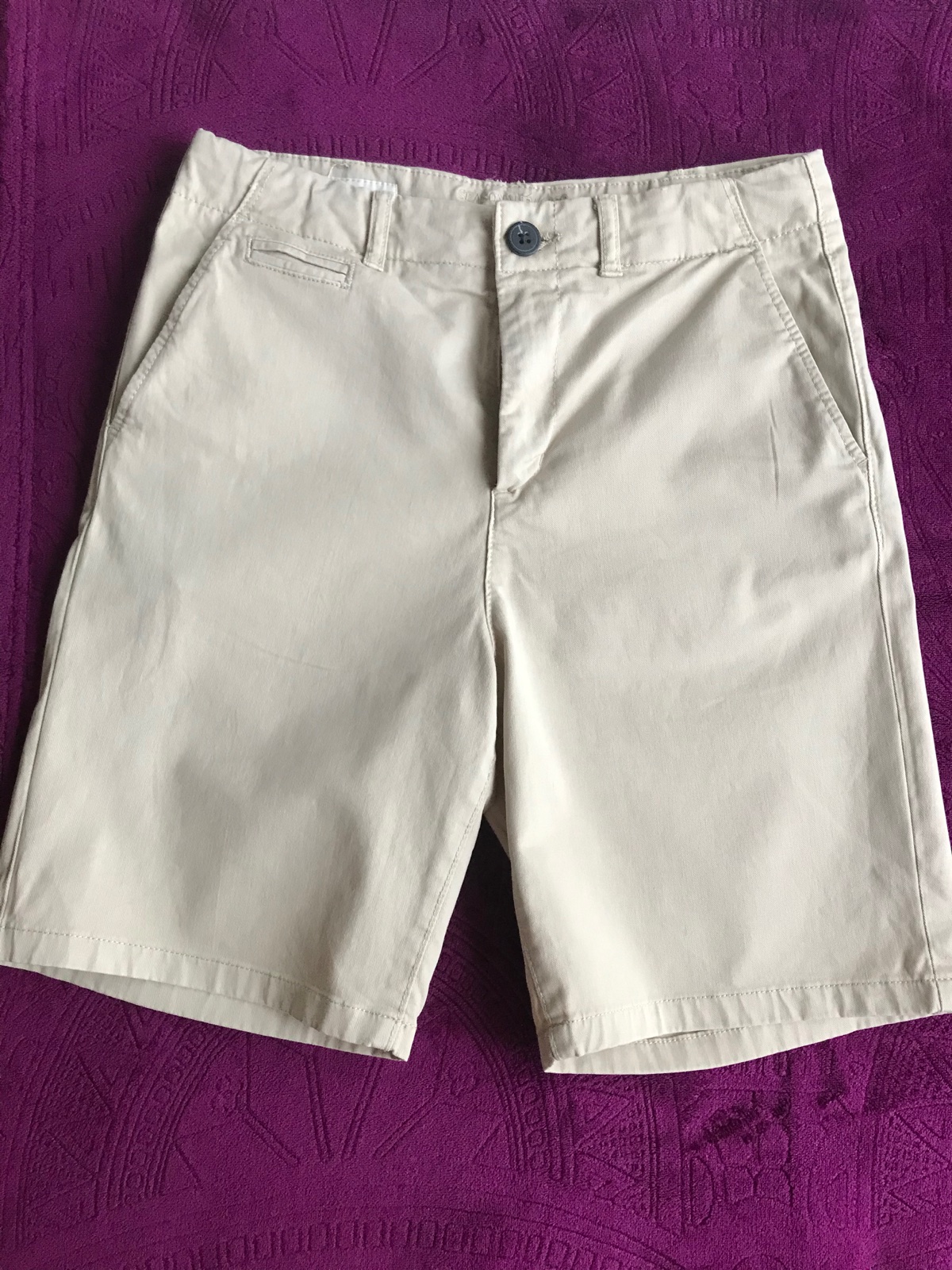 Ako nové bez poškodenia. Pevný materiál. Zloženie: 97% bavlna, 3% elastan. Všetky vrecká sú funkčné. Velkost uvedená 152, vek 11-12 rokov - aj to sedí. Celková dĺžka - 43 cm. Šírka v pase - 2x35 cm, dá sa prispôsobiť gumičkami. Odporúčam👍👍👍👍