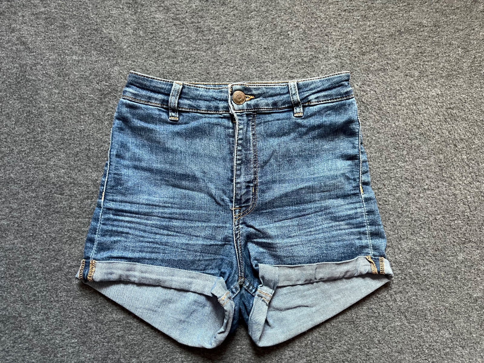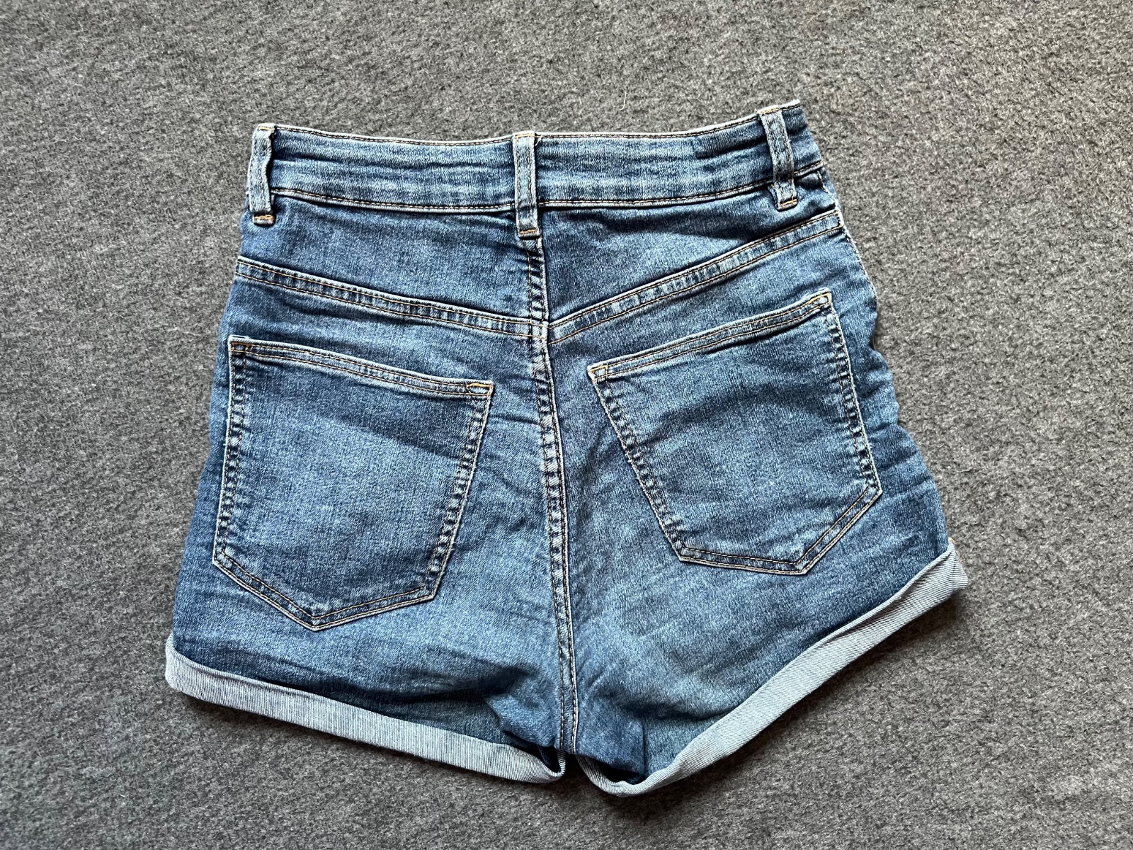 Párkrát oblečené rifľové kraťasy elastické tenká riflovina. Príjemný materiál. Veľkosť S.