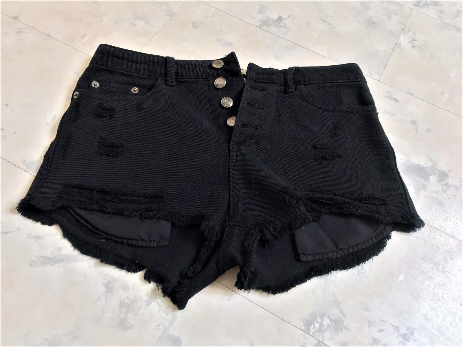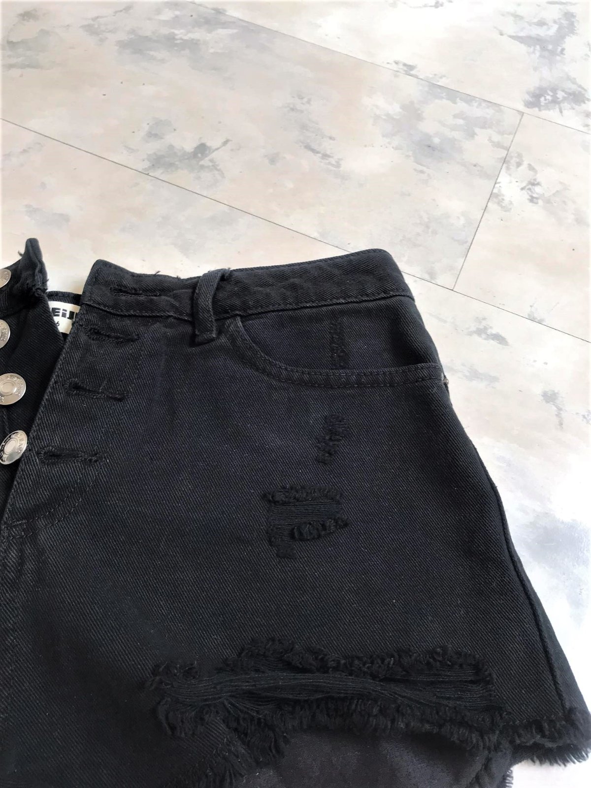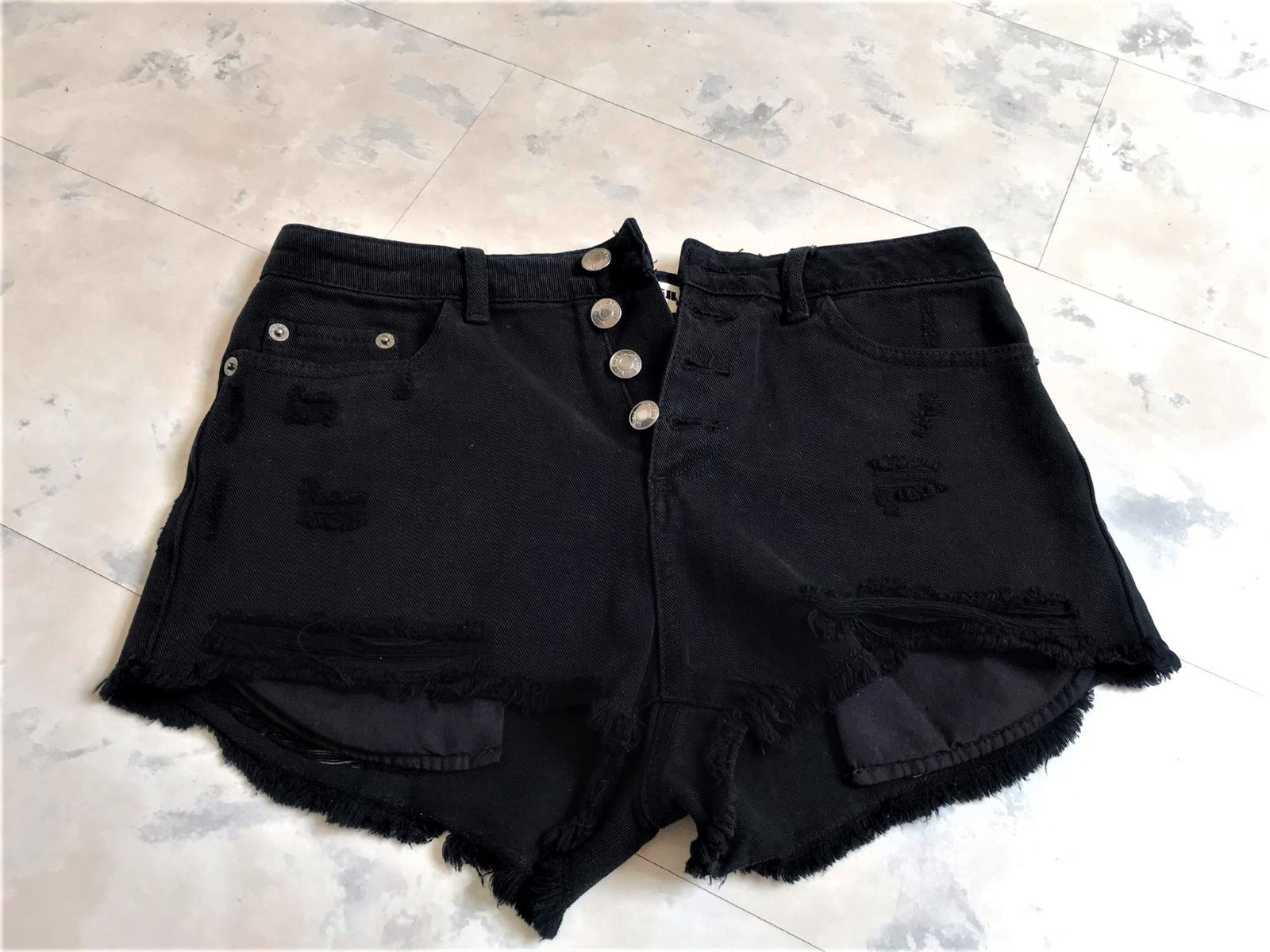 top stav,kvalitné a značkové,vzhľad odratých neukončených krátkych riflí,vpredu presahujú vrecká,sýto čierna farba,moderný vyšší sed,zapínanie na gombíky,pás = 37 -38 x 2 cm, boky = 45 - 47 x 2 cm,dlžka meraná na boku= 26 cm, predný sed = 26 cm, zadný sed = 38 cm,vyfotené s bleskom aby vynikli detaily....