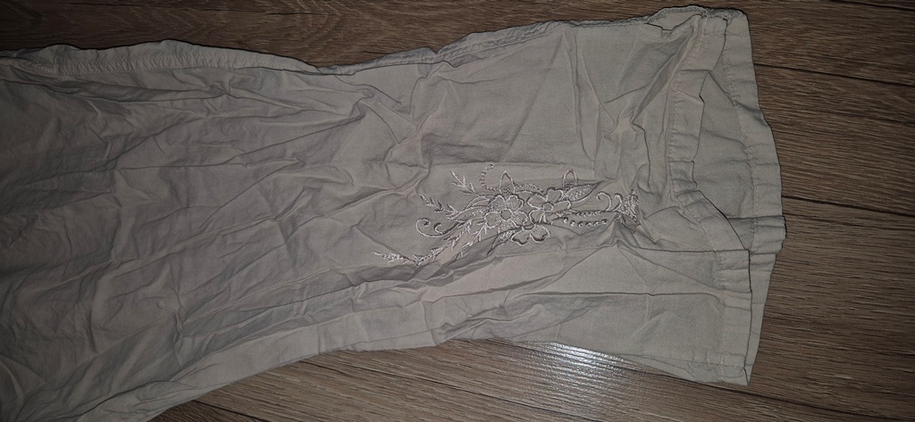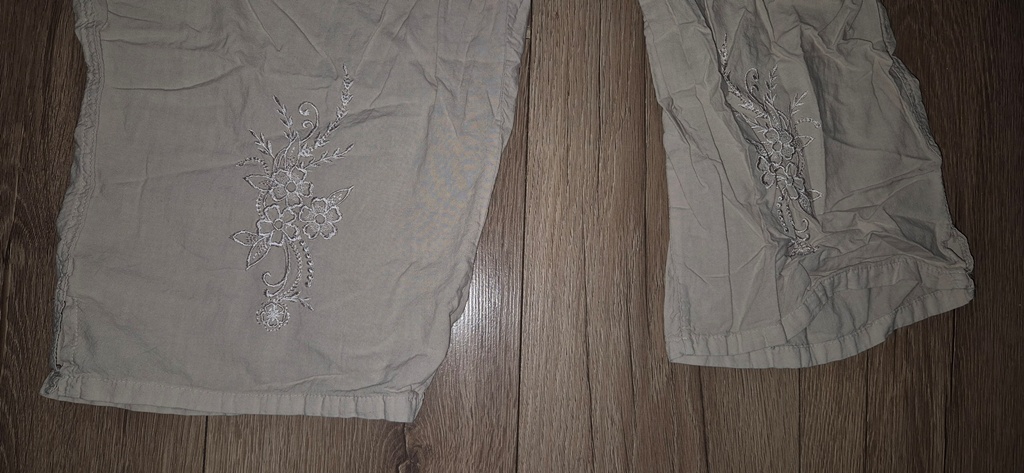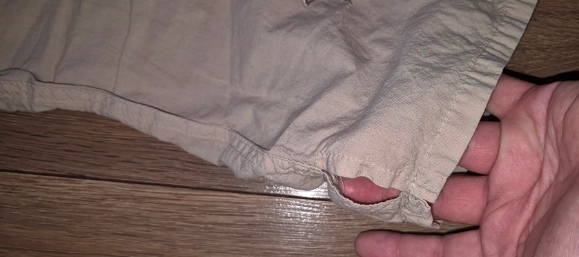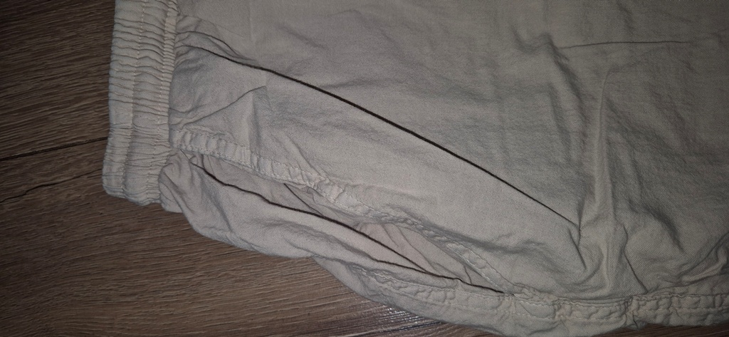 bledučké, jemné kraťasy, tenké, zloženie bavlna na spodku vyšité, bočné rozparky sú ešte stále zašité, majú aj vrecká, sú pokrčené, ale keďže ich budete prať, tak si ich aj ožehlíte, dobrý stav