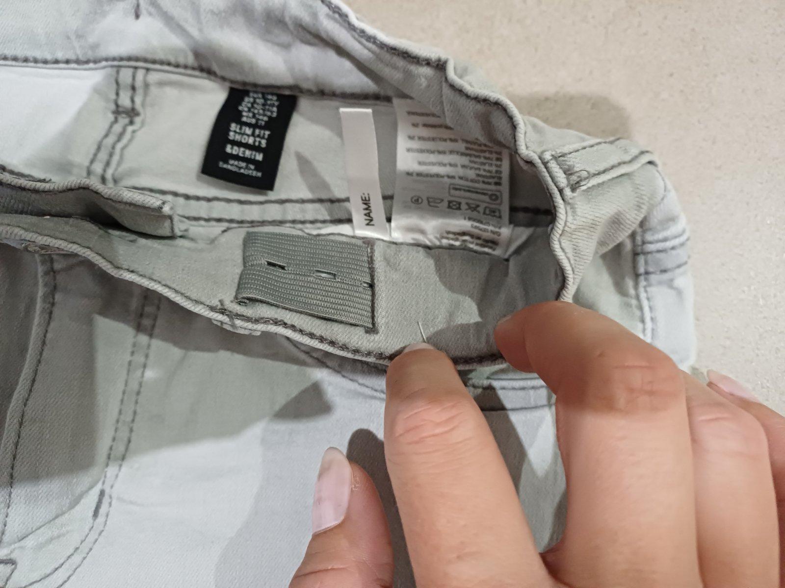 Predám zachovalé frajerské kraťasy z tenkej rifloviny. Farba je svetlosivá, pás je regulovateľný. Uvedená veľkosť 146. Maximálna šírka v páse 2x 35cm. Celková dĺžka 42,5cm, po rozrolovaní +3,5cm.