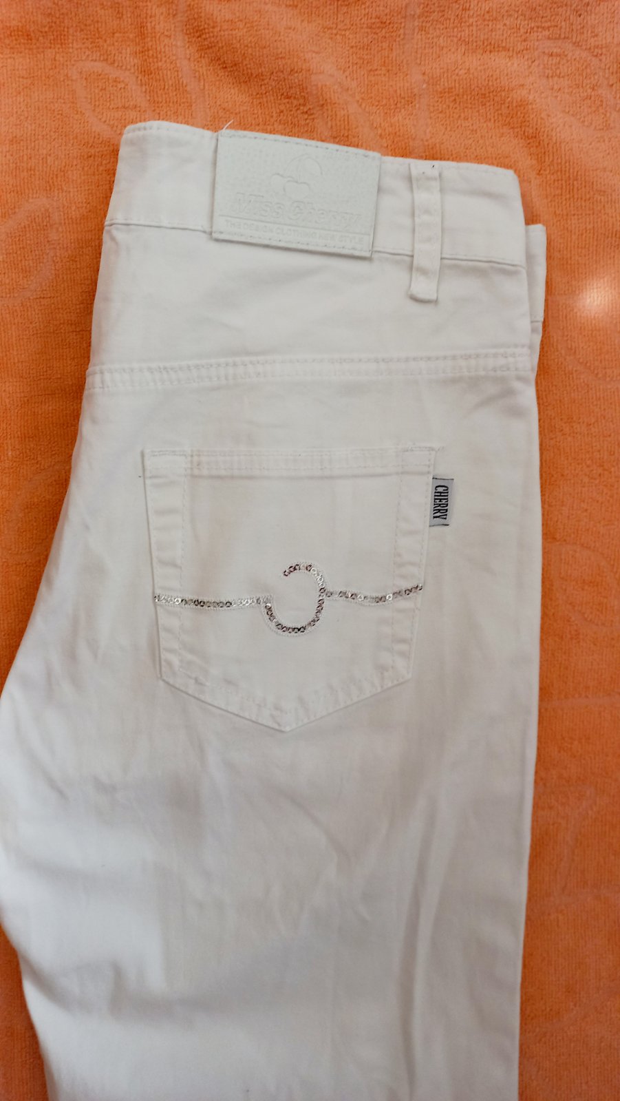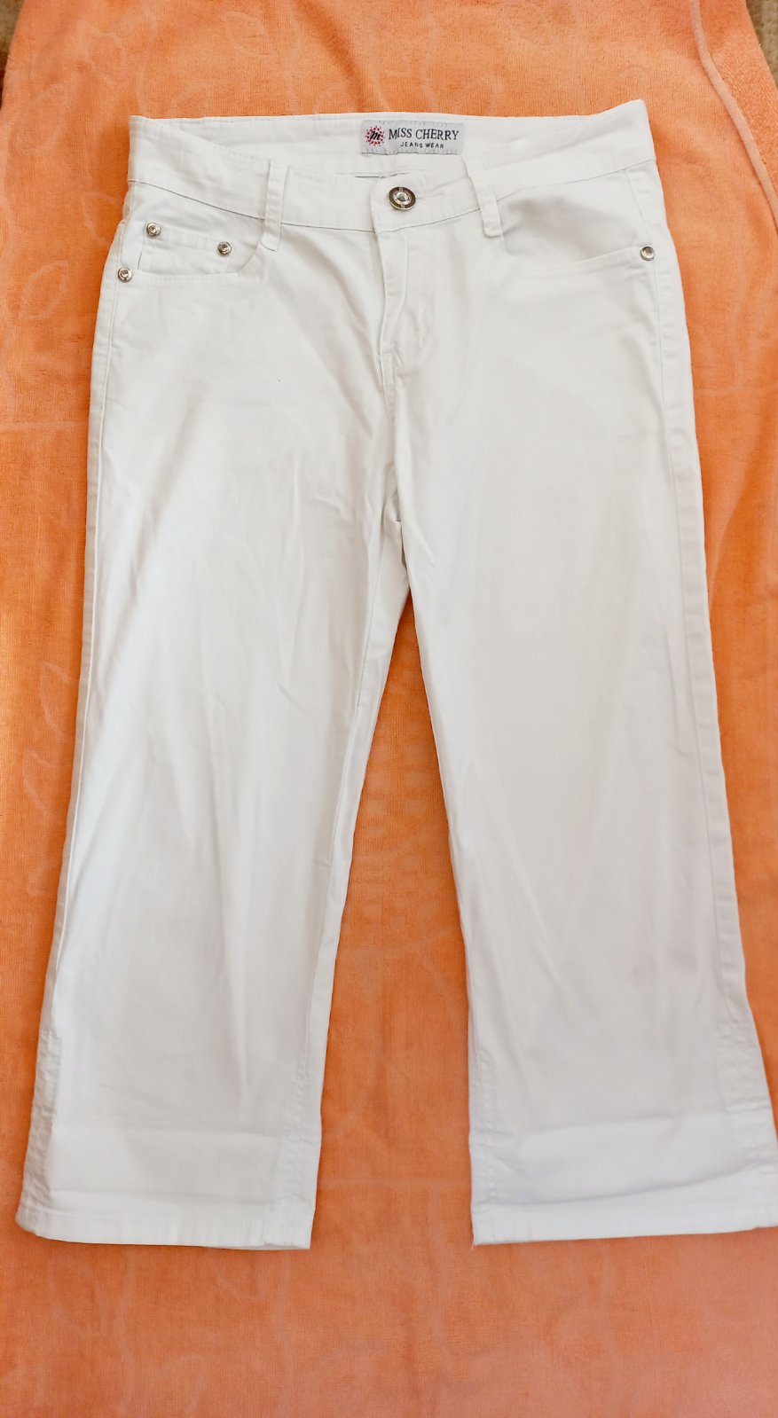 Veľmi pekné nohavice 3/4. Dĺžka 77 cm, pás 38 cm. Vhodné pre S veľkosť. Boli zahnuté v dolnej časti na 2x. Pekné prepracovanie. ZN: MISS CHERY