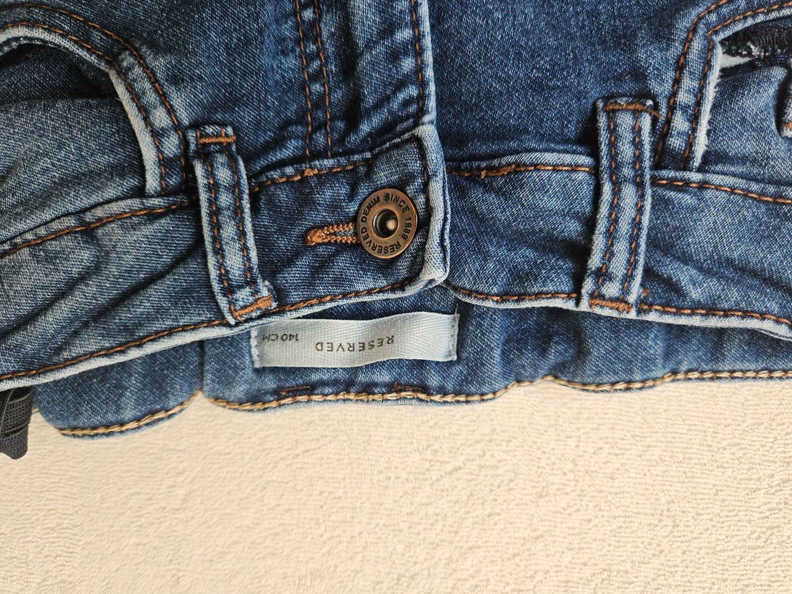 Kraťasy rifľové veľ.140 bez poškodení. Možnosť nastavenia šírky v páse pomocou gumičiek.