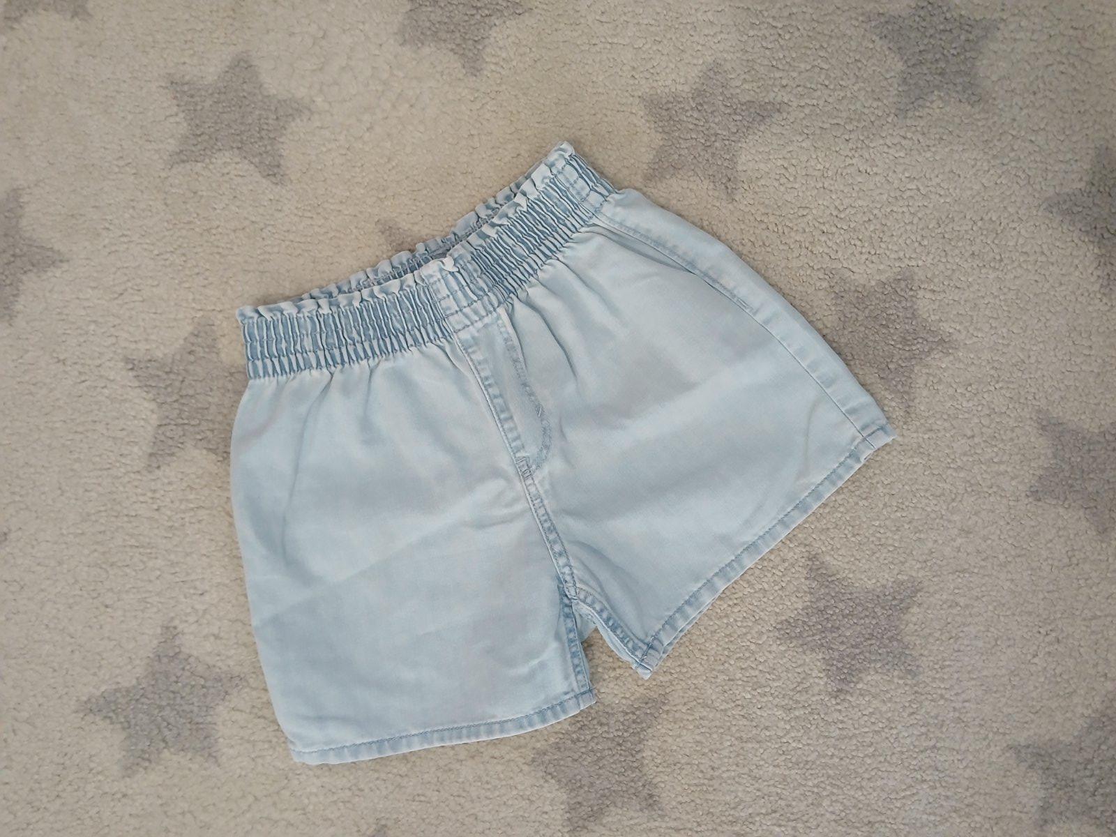 Dievčenské riflové , elastické kraťasy, farba tmavšia modrá kombinovaná svetlejšiou modrou + biela motív kvety. V páse regulovatelná gumka, boky sú ozdobené hačkovaným. Dobrý nosený stav.