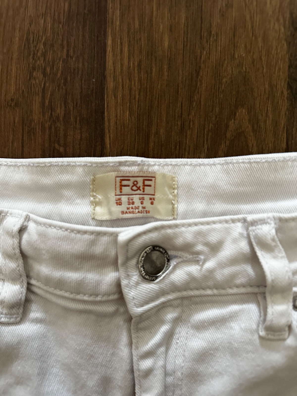 Predávam biele rifľové kraťasy značky F&F, vo veľkosti 38. Kraťasy sú z pevného, no príjemného rifľového materiálu, vhodné na bežné nosenie počas leta. Majú klasický strih, sú pohodlné a dobre sedia na postave. Stav je výborný – minimálne nosené, bez známok poškodenia.