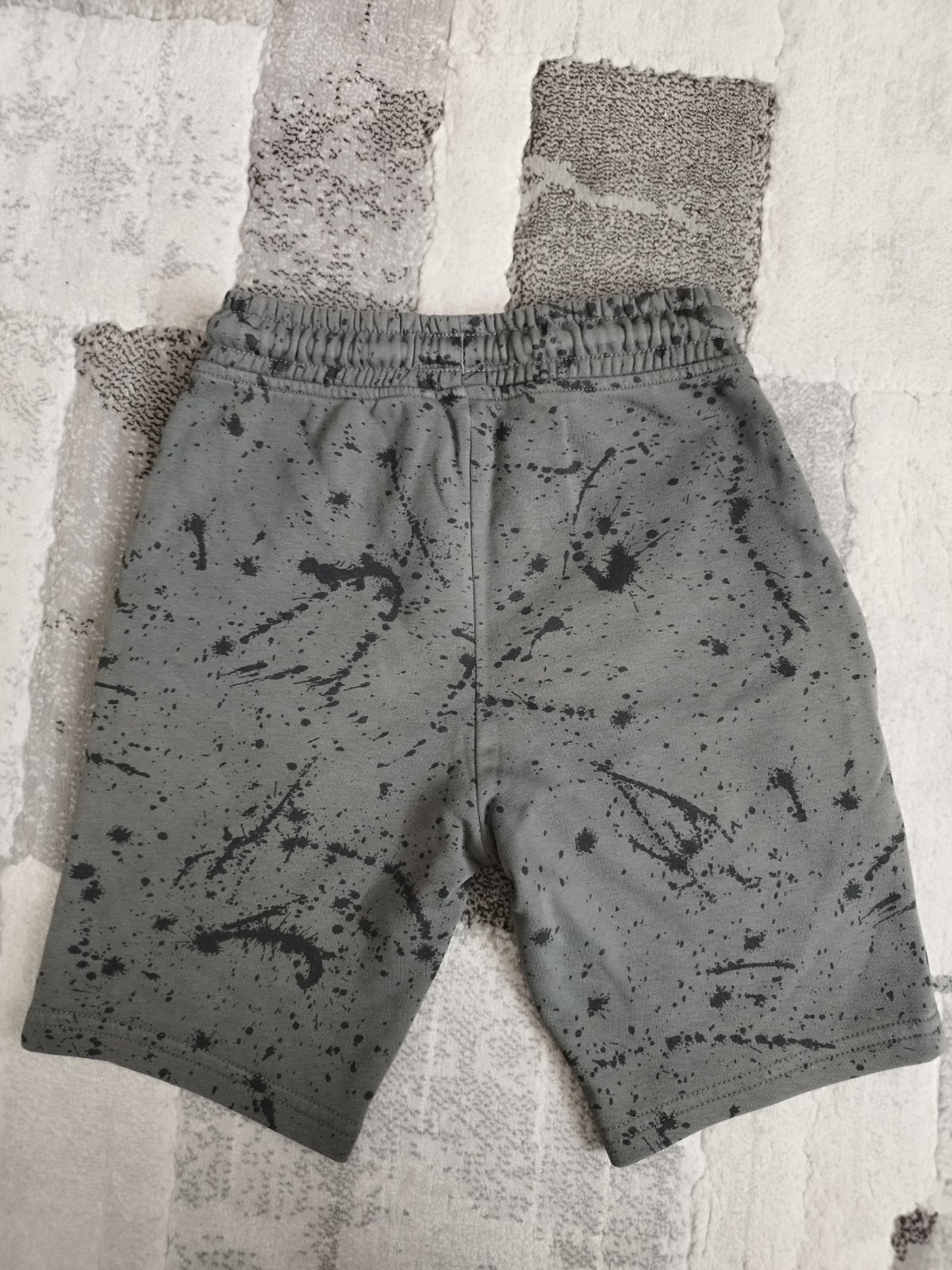 Kraťasy v top stave, vzadu asi chybička na látke (biela bodka, vid 2. foto) od novoti, nám to nevadilo. Veľkosť 128/134 na 8-9 rokov, pás sa nedá regulovať, ja som pás synovi upravila, lebo je chud...
