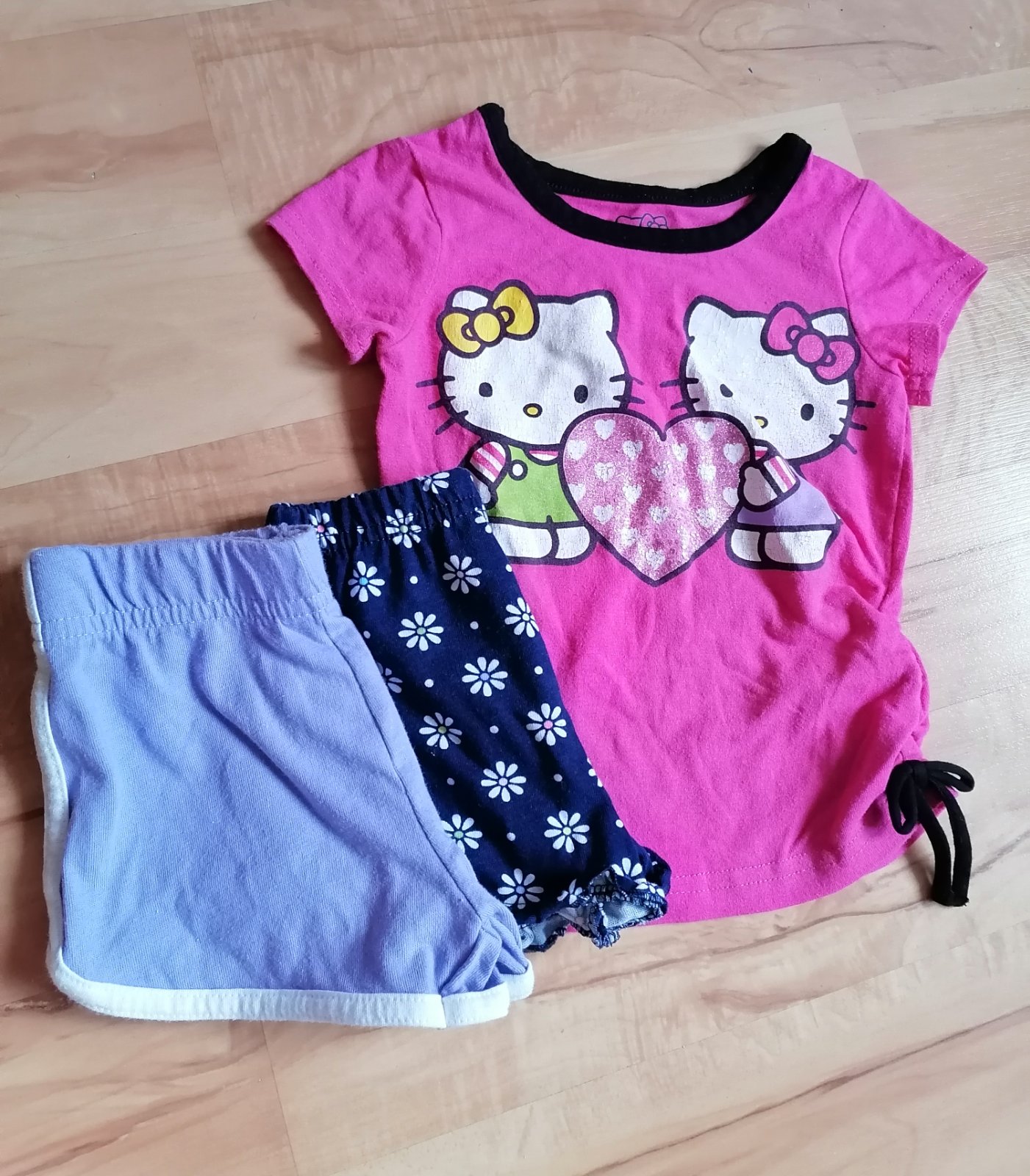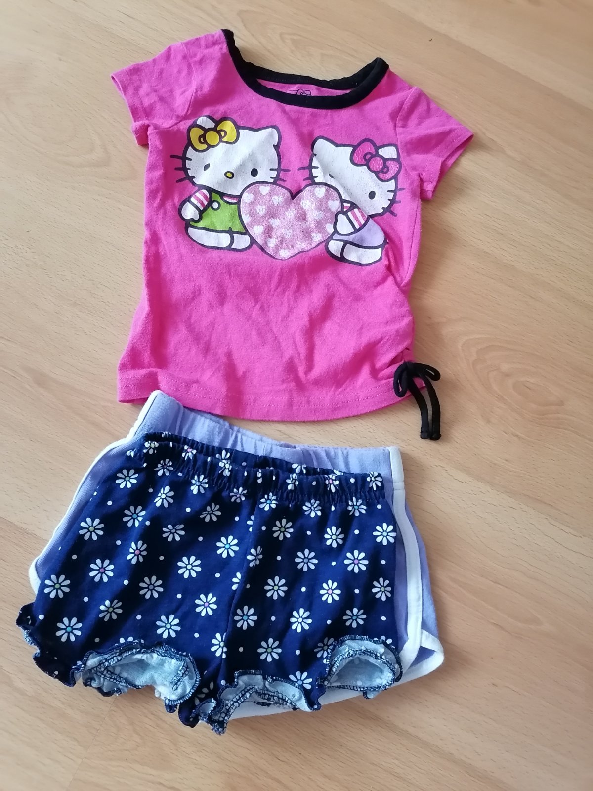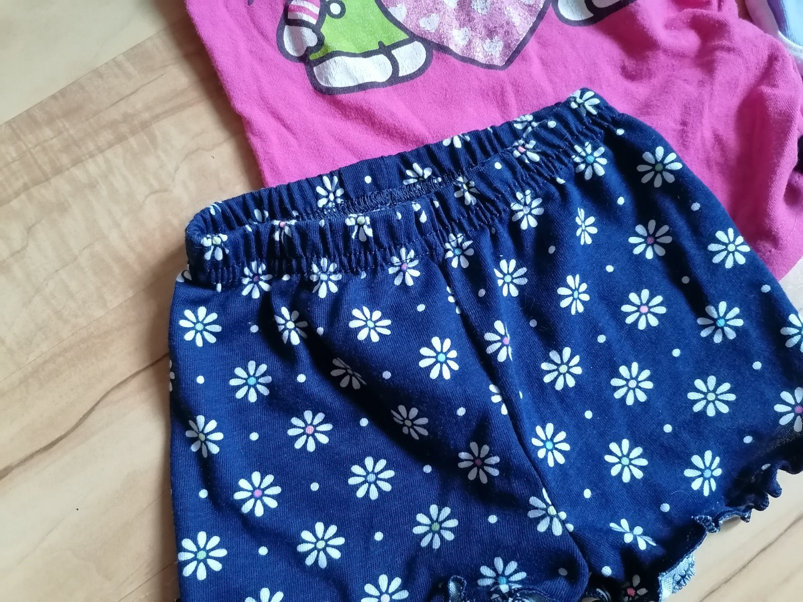 Pekný zachovalý stav, akurát tričko trochu aplikácia popukaná. Cena spolu. Kvietkované modré kraťasky sú ako nové, možno 1-2x max. vzaté.