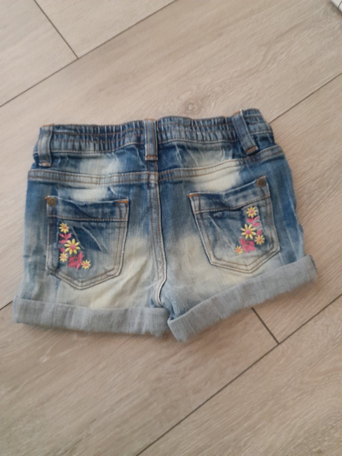 Predám v top stave riflové kraťase, veľkosť 110 (4-5rokov), možnosť stiahnúť na gumicku s gombíkom, pás v nenatiahnutom stave 2x26cm, dĺžka 26cm.